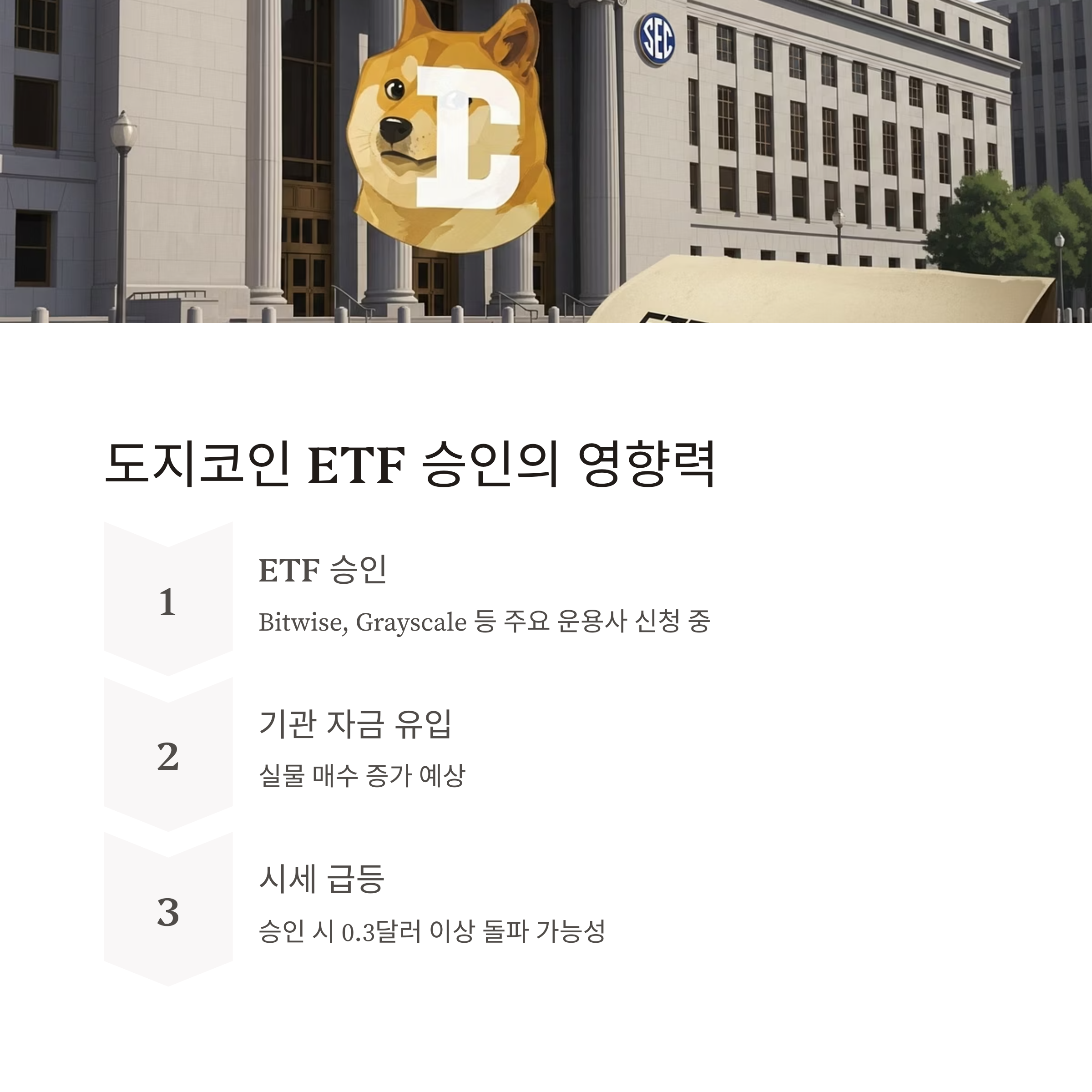 비트코인 ETF 사례처럼 승인 직후 기관 자금 유입 → 실물 매수 → 시세 급등 흐름이 나타날 가능성이 크며, 승인 시 도지코인도 단숨에 0.3달러 이상을 돌파할 수 있다는 분석도 존재합니다.