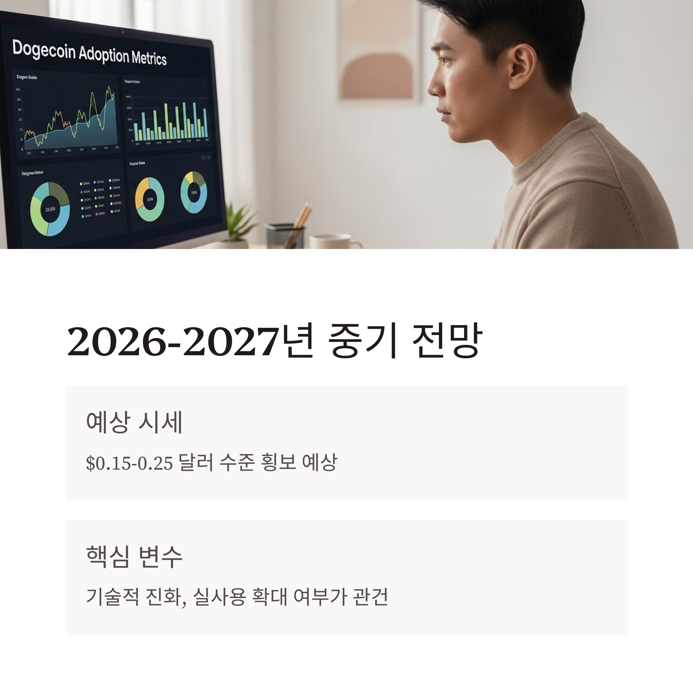 2026~2027년은 과열된 시장이 조정 국면에 접어들며 도지코인이 횡보하거나 약세로 전환할 가능성이 높습니다. 평균 시세는 $0.15~0.25 달러 수준으로 예측되며, 이 기간은 도지코인의 기술적 진화나 실사용 확대가 이루어지지 않는 한 거래량 정체와 투자심리 위축이 나타날 수 있습니다.