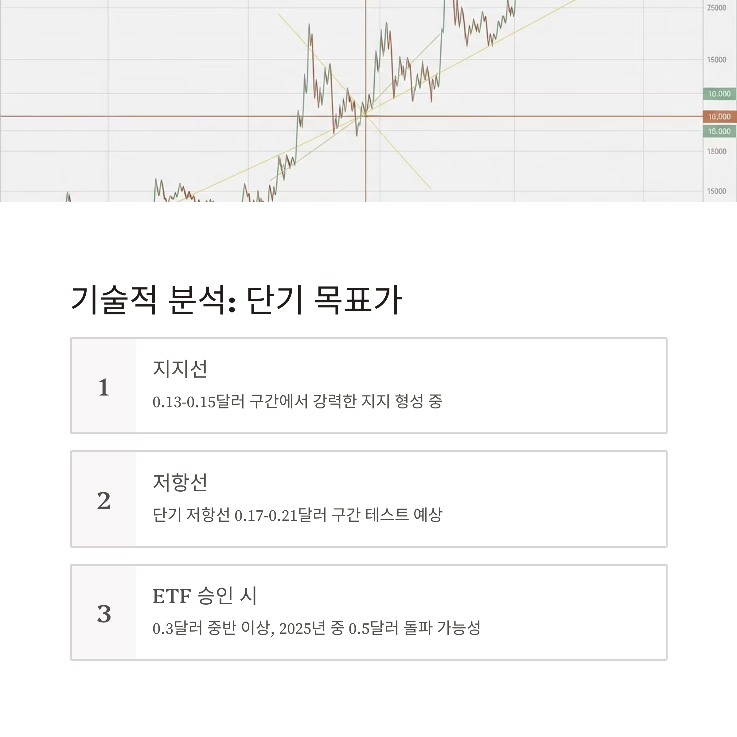 만약 ETF 승인이라는 강력한 뉴스가 겹칠 경우, 0.3달러 중반 이상도 노려볼 수 있으며, 일각에서는 2025년 중 0.5달러 돌파 가능성까지 제기하고 있습니다. 다만 지지선 이탈 시에는 0.08달러 수준까지의 조정도 배제할 수 없습니다.