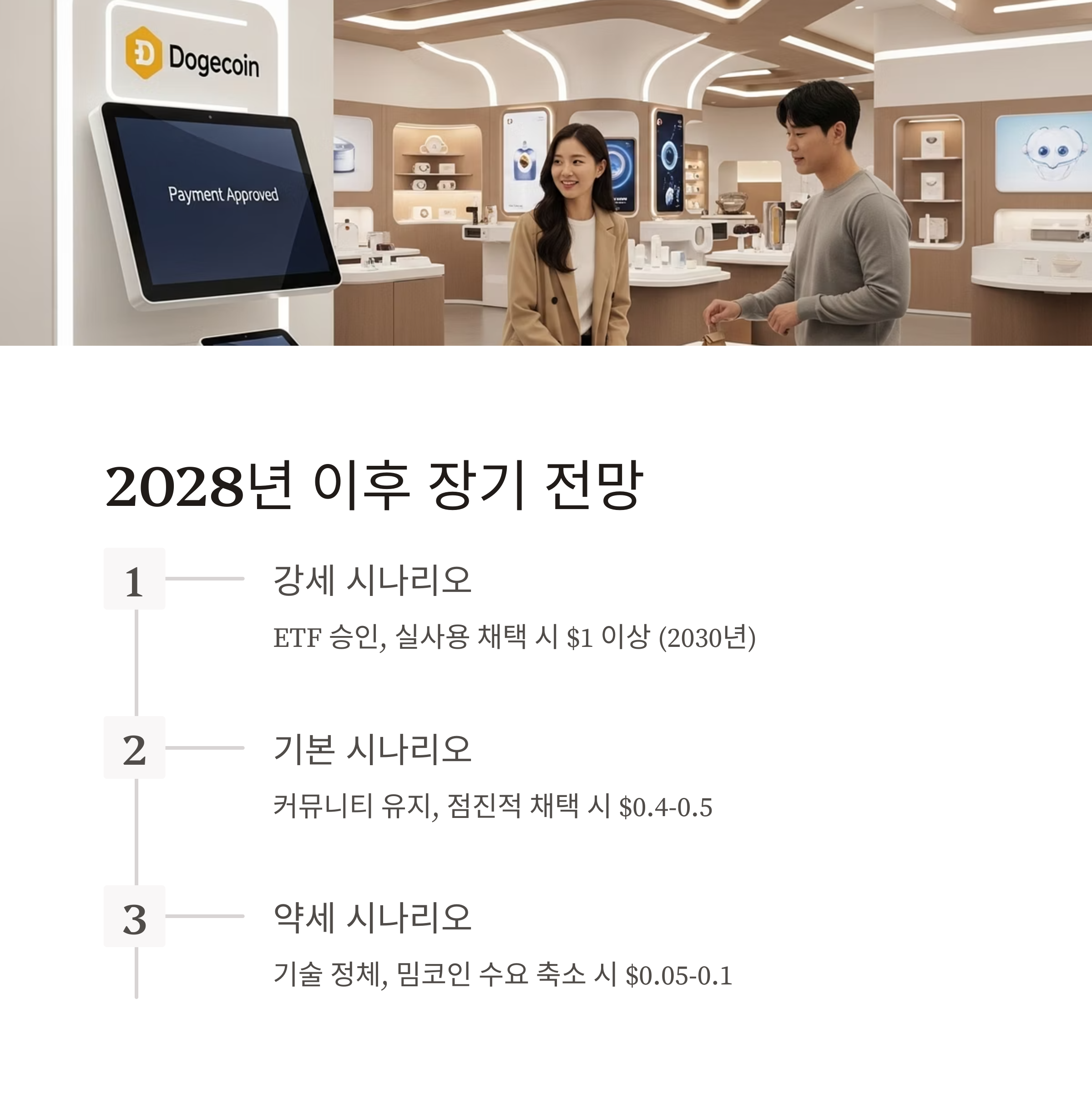 장기적으로 도지코인은 단순 밈코인에서 실사용 기반 자산으로 진화할 수 있느냐가 핵심 과제가 됩니다. 트위터/X, 테슬라 등에서 도지코인을 결제 수단으로 채택하는 등 실사용 환경이 확대된다면, 2030년 전후에는 $1 달러 돌파 가능성도 제기됩니다.