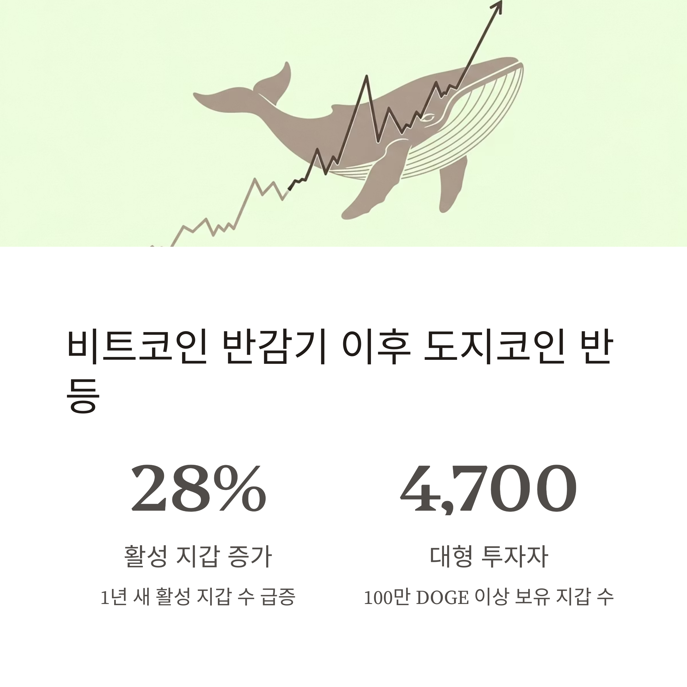 도지코인 온체인 지표에 따르면 활성 지갑 수는 1년 새 약 28% 증가했고, 100만 DOGE 이상 보유 지갑 수도 4,700개로 급증했습니다. 이는 단기적으로 투자심리가 개선되고 있음을 보여주는 대표적 신호입니다.