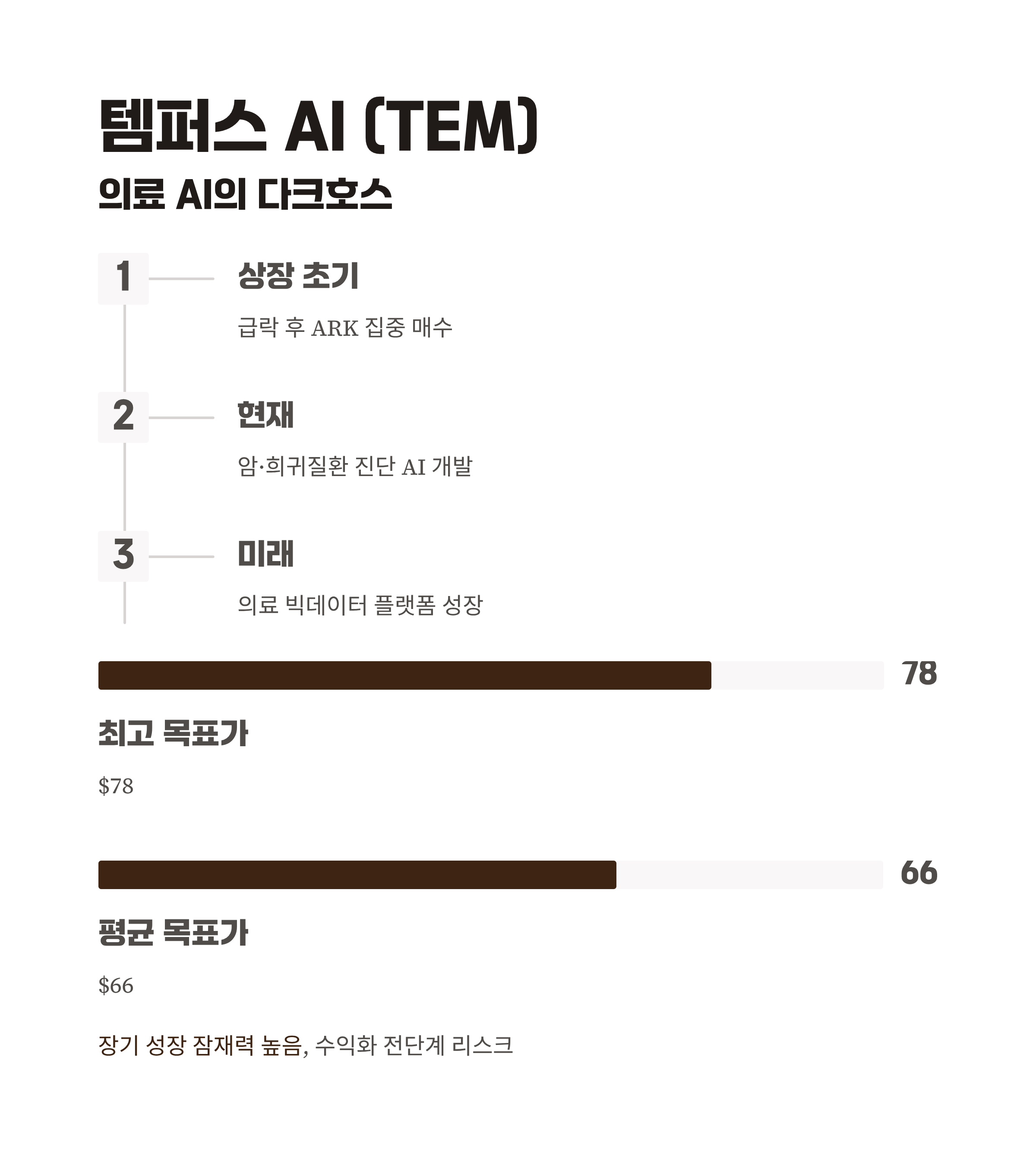| TEM | 의료 AI·데이터 분석 | $66~$78 | 상장 초기 리스크·수익화 미확정 |