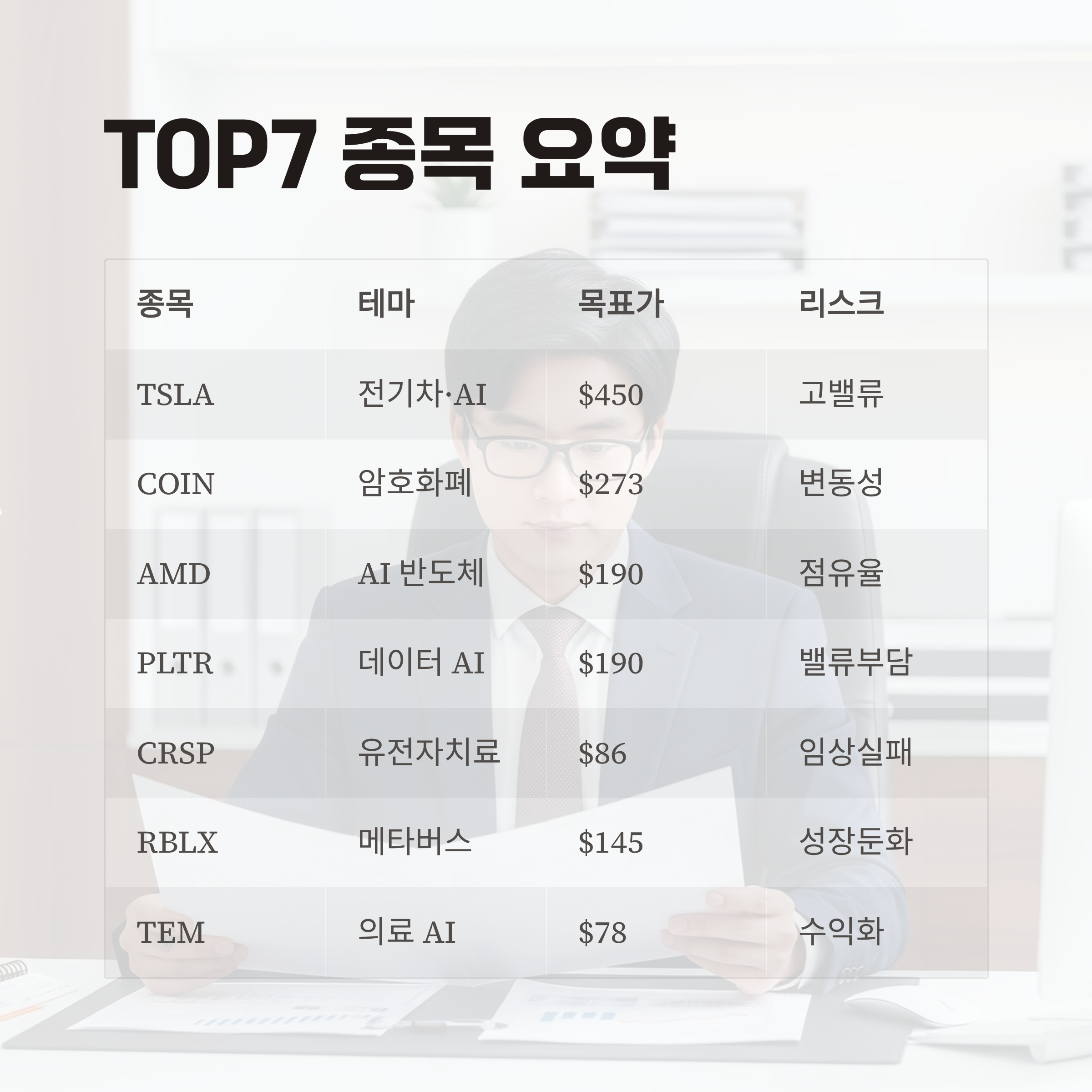 이번 글에서는 ARK 포트폴리오에서 핵심 비중을 차지하는 AI·반도체·크립토 7개 주요 종목을 뽑아 특징, 목표주가, 리스크 요인까지 상세히 분석해봤습니다.