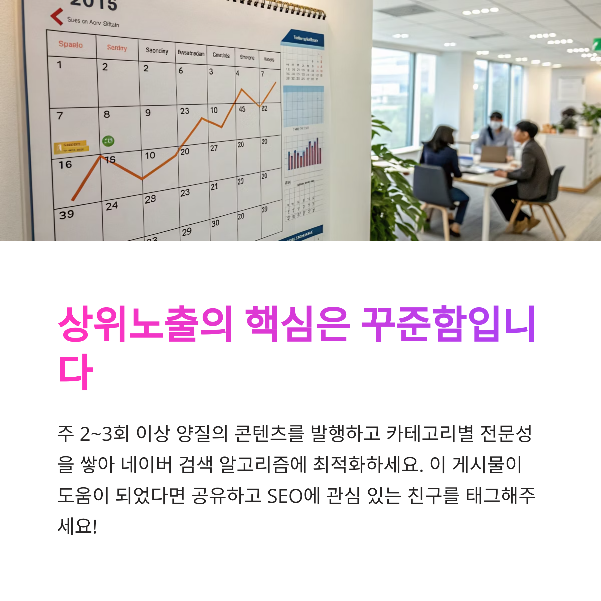 마지막으로 중요한 전략은 카테고리 정렬과 글 발행 주기입니다. 네이버는 블로그 내 카테고리별 전문성을 평가합니다. 따라서 같은 주제의 글을 모아 카테고리를 구성하고, 주 2~3회 이상 꾸준히 글을 발행하면 해당 블로그를 해당 분야의 ‘전문 소스’로 인식합니다. 또한 서이추(서로이웃 추가)를 통한 초기 유입 확보, 키워드 도구(네이버 키워드플래너, 트렌드)로 사전 조사하는 습관도 매우 중요합니다.