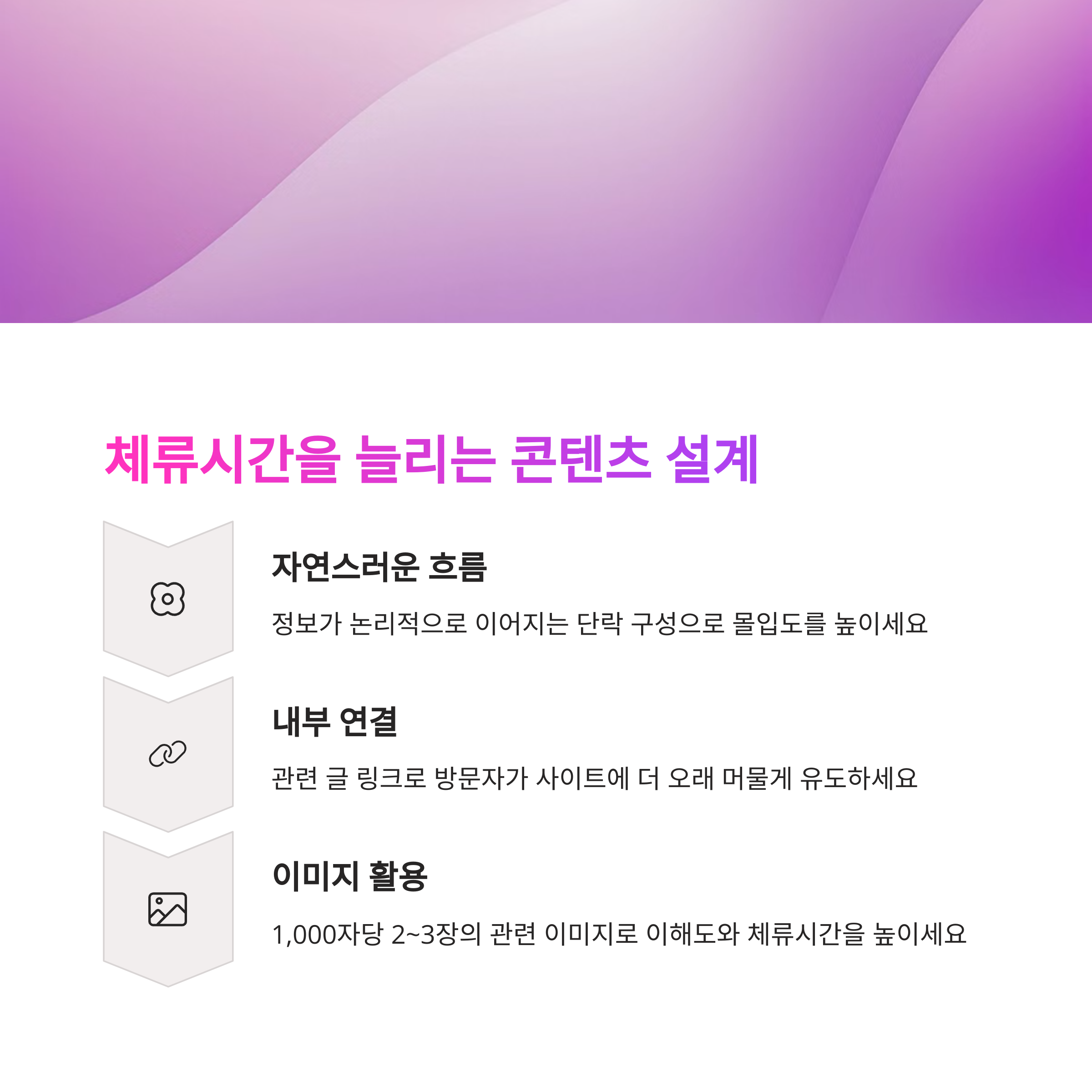 | 주력 콘텐츠 | 제목+본문 키워드 일치율 / 사용자 체류시간 / 모바일 가독성 |
