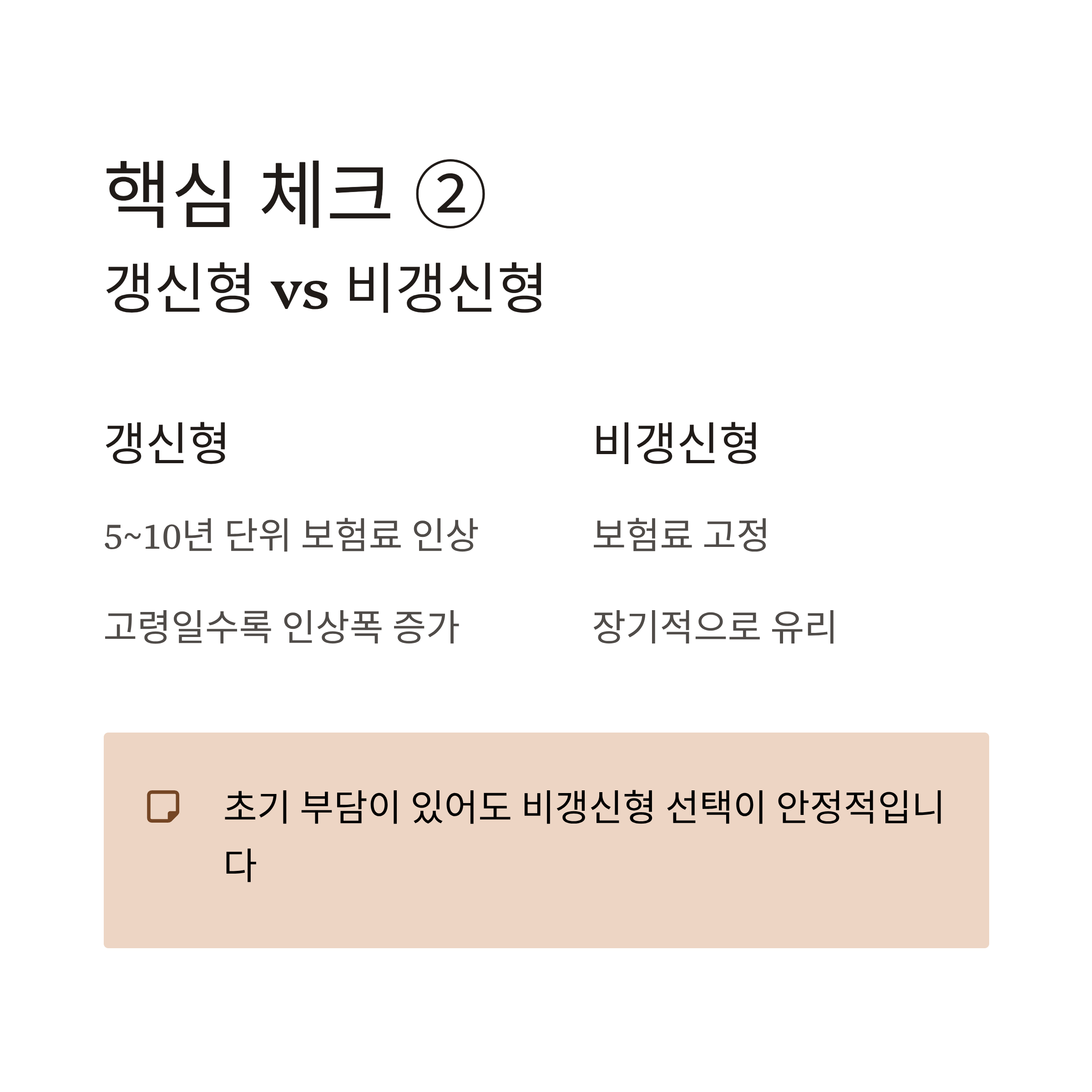 → 가능하다면 초기에 부담이 좀 있더라도 비갱신형 상품을 선택하는 게 안정적입니다.