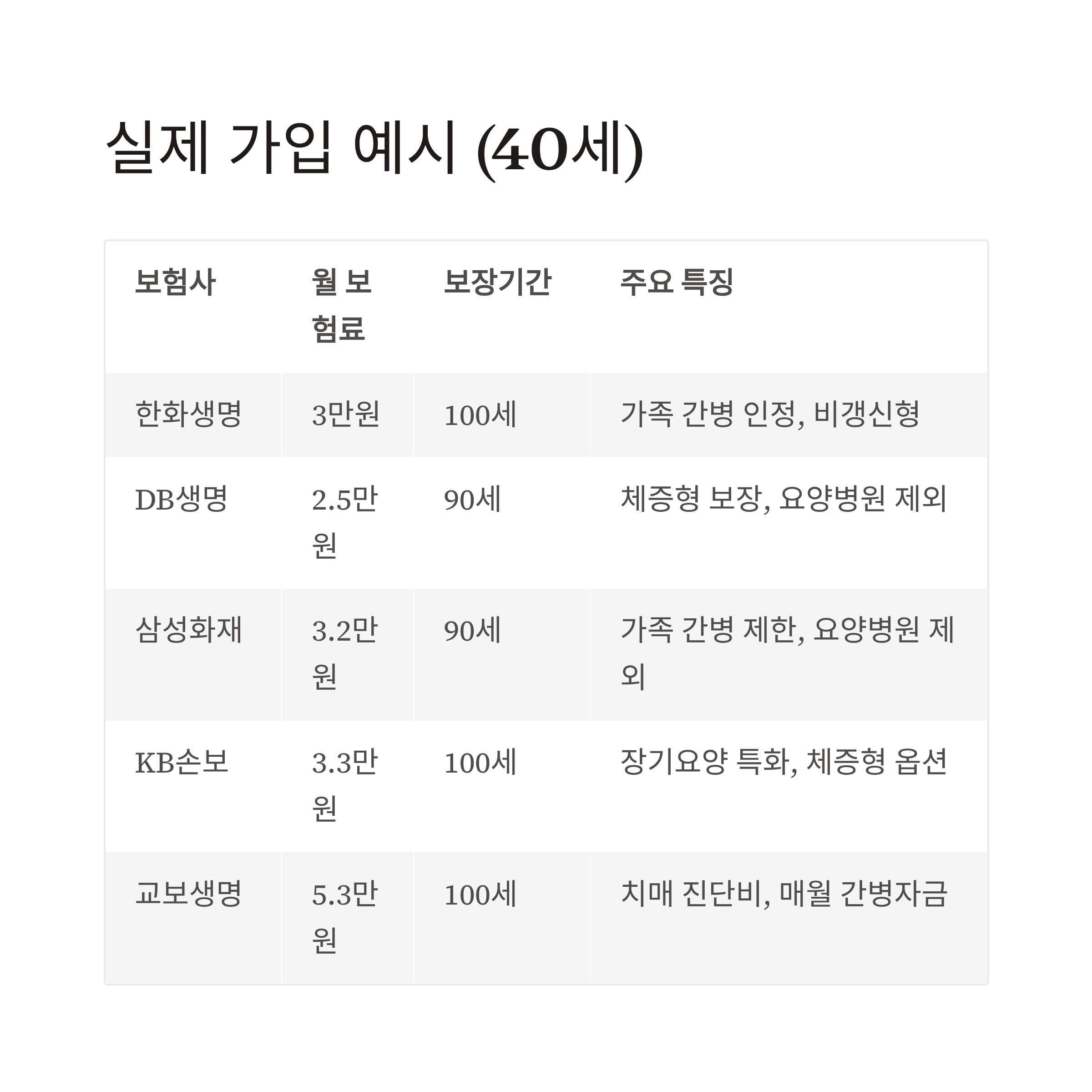 실제 가입 예시 요약표 (40세 기준)