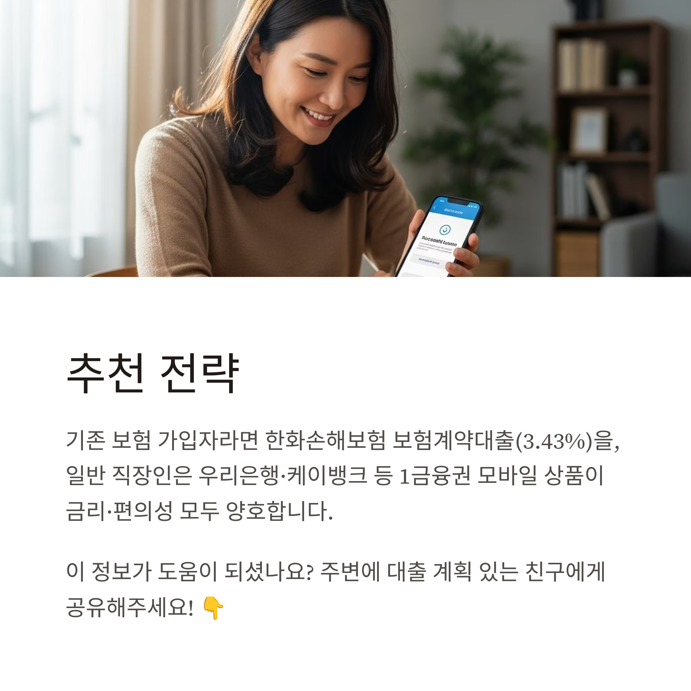 - 최저 금리 우선: 기존 보험 가입자라면 한화손해보험 보험계약대출 고려