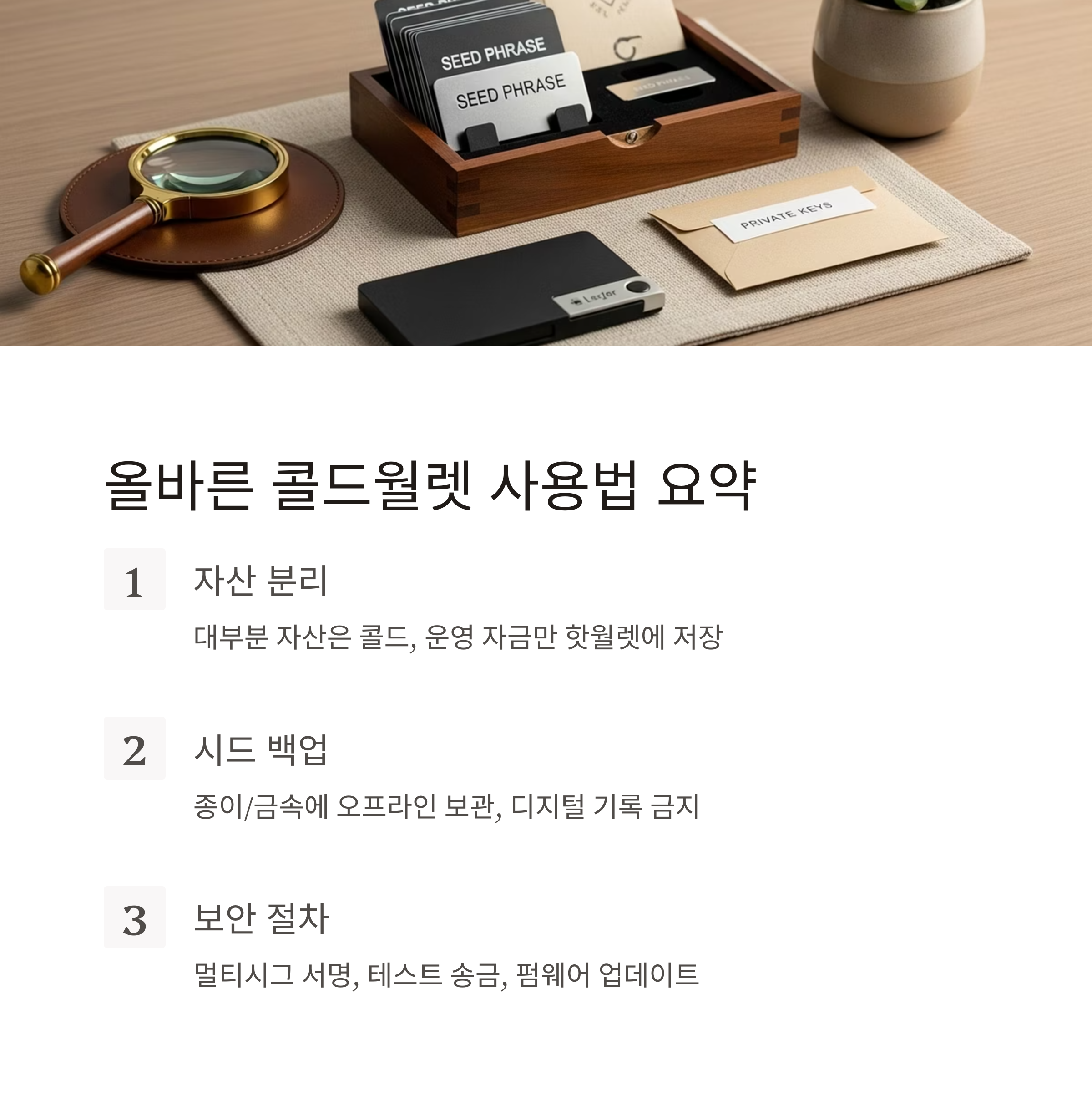 | 보안 절차 | 멀티시그 서명, 테스트 송금, 펌웨어 업데이트 필수 |