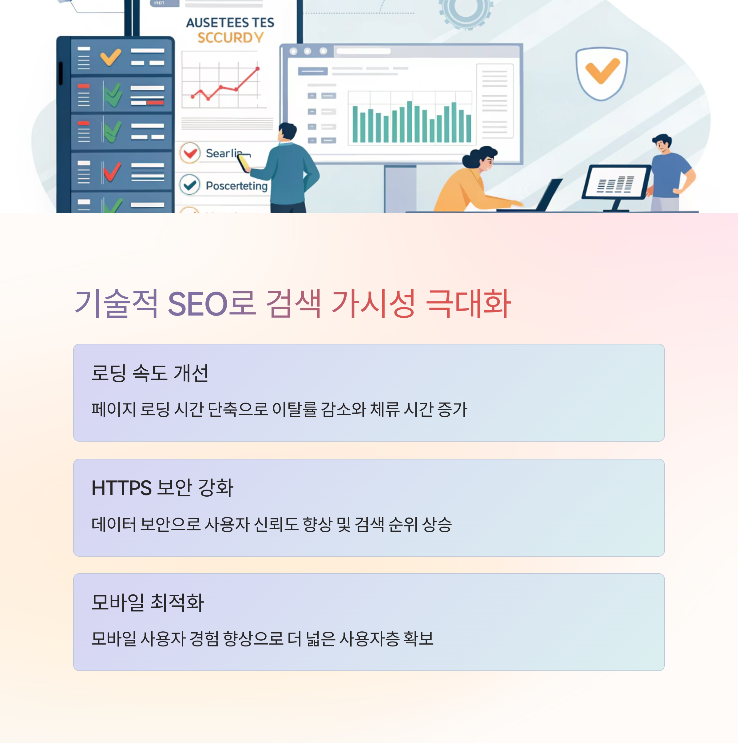 세 번째, 기술적 SEO가 중요한데, 반응형 디자인, HTTPS 보안 인증, 사이트맵 제출 등이 중요합니다.