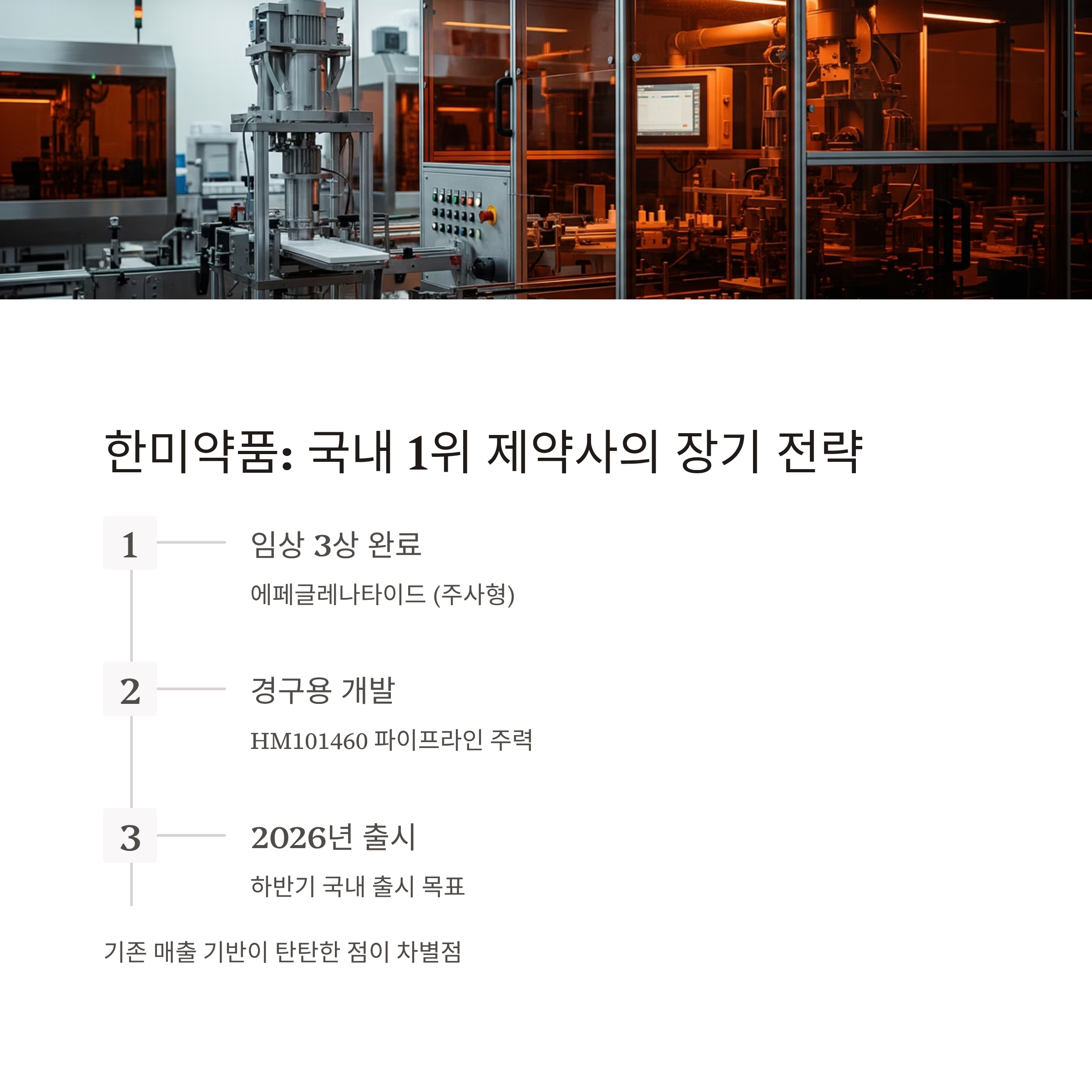 한미약품은 '에페글레나타이드'(GLP-1 주사형)의 국내 임상 3상을 마쳤으며, 후속 경구용 파이프라인 HM101460에 주력하고 있습니다.