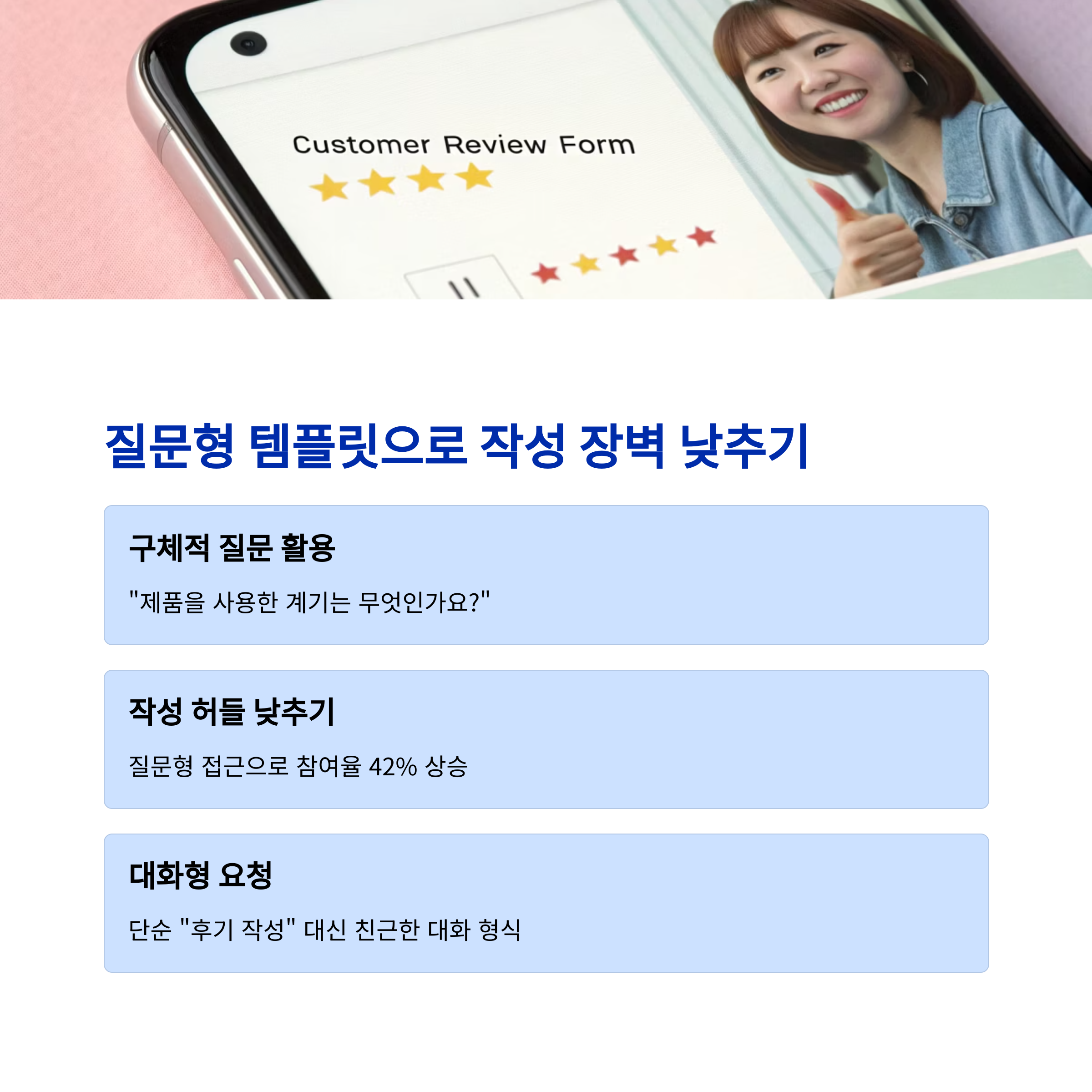 | 리뷰는 받는 타이밍(1~2일 후)이 중요 | 질문형 문구가 참여율 3배 이상 증가 | 후기 노출이 또 다른 후기를 부른다 |