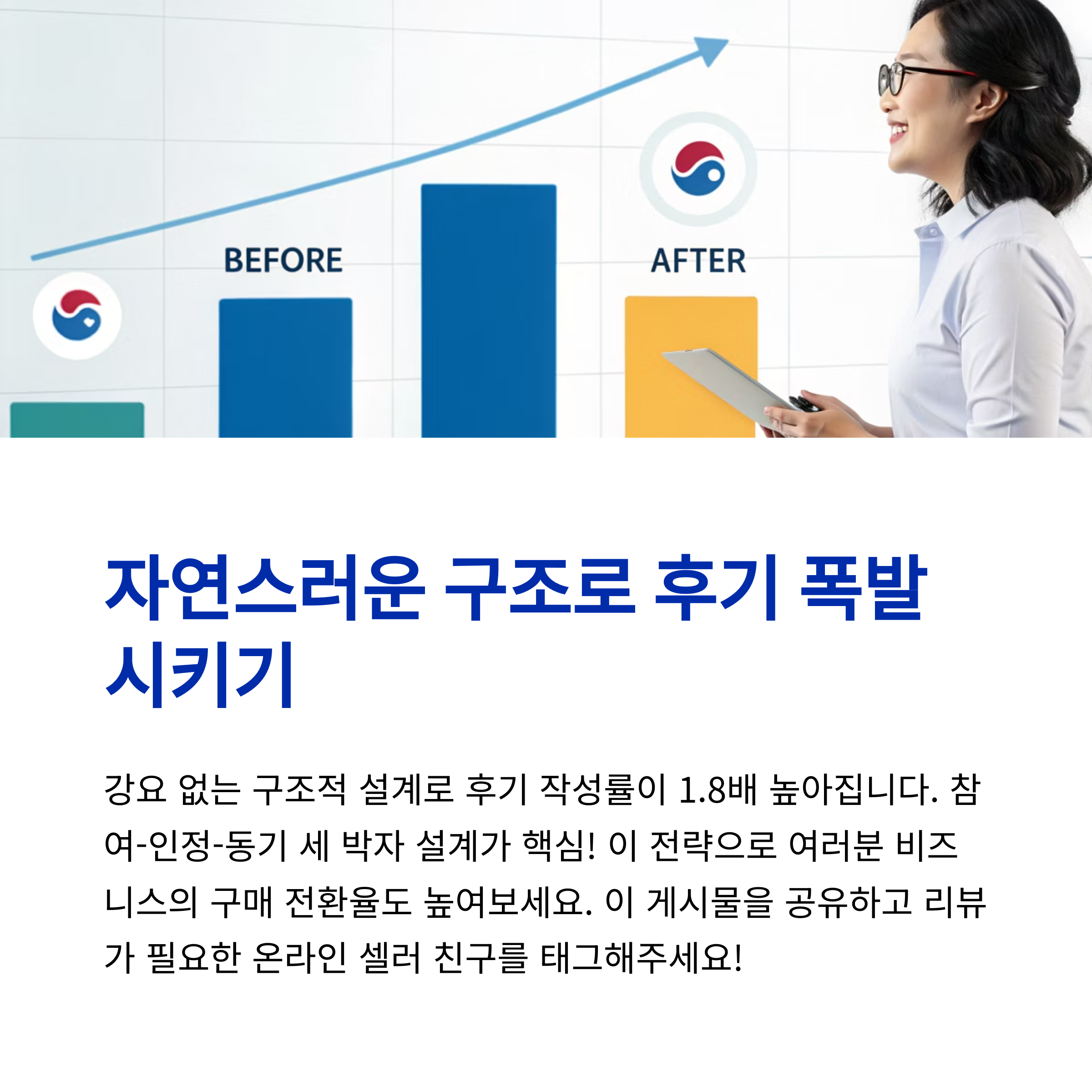 | “다른 분께 도움을 주세요”형 안내 + 감사 문구 | “가장 만족한 점은?”, “어떤 분께 추천하시나요?” | 상단 후기 요약 + 하단 참여 유도 + SNS 공유 |
