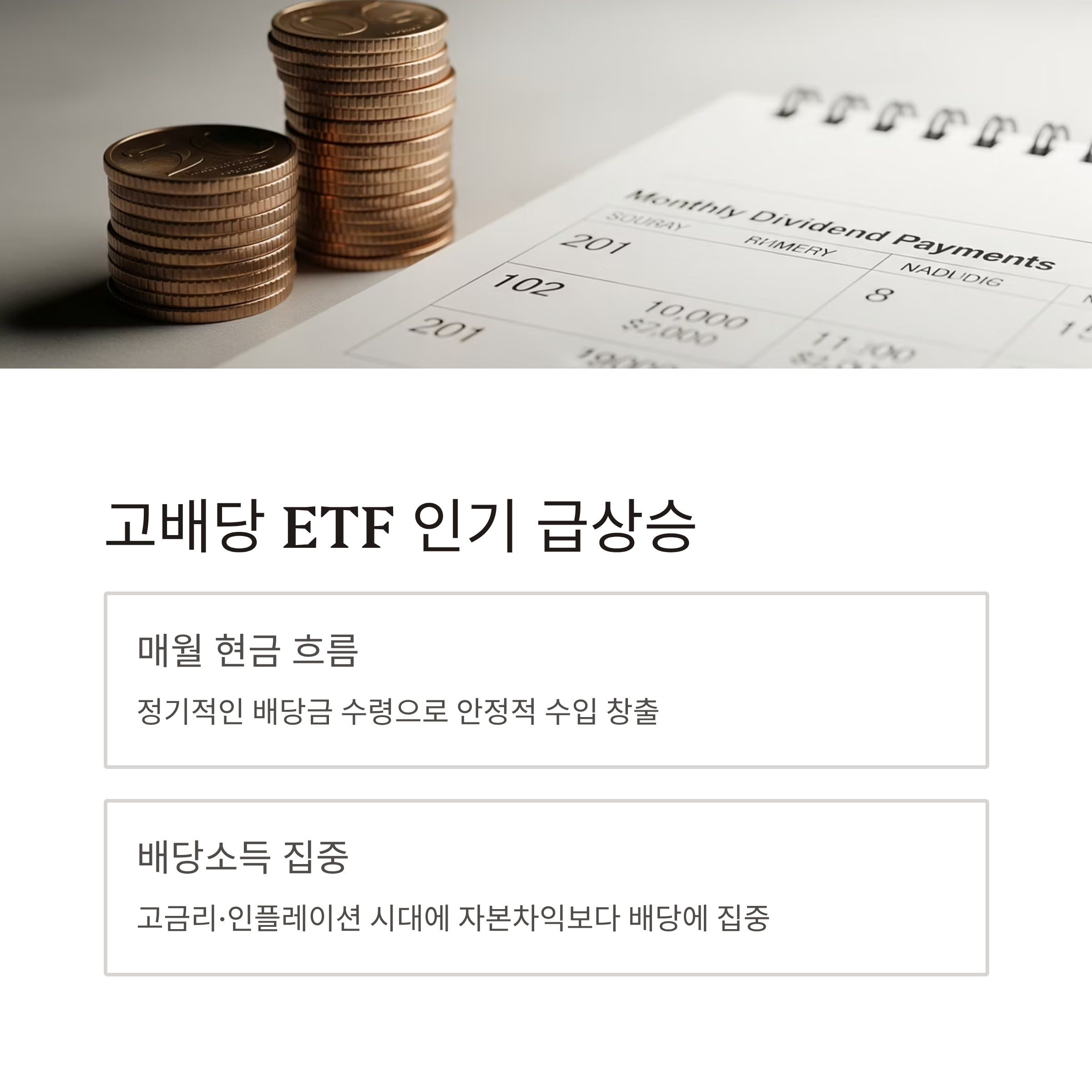 2025년 들어 고배당 ETF에 대한 관심이 폭발적으로 늘고 있습니다. 매월 현금 흐름을 만들 수 있는 구조와 더불어, 고금리·인플레이션 국면 속에서 자본차익보다 배당소득에 집중하려는 투자자들이 증가하고 있기 때문이죠.
