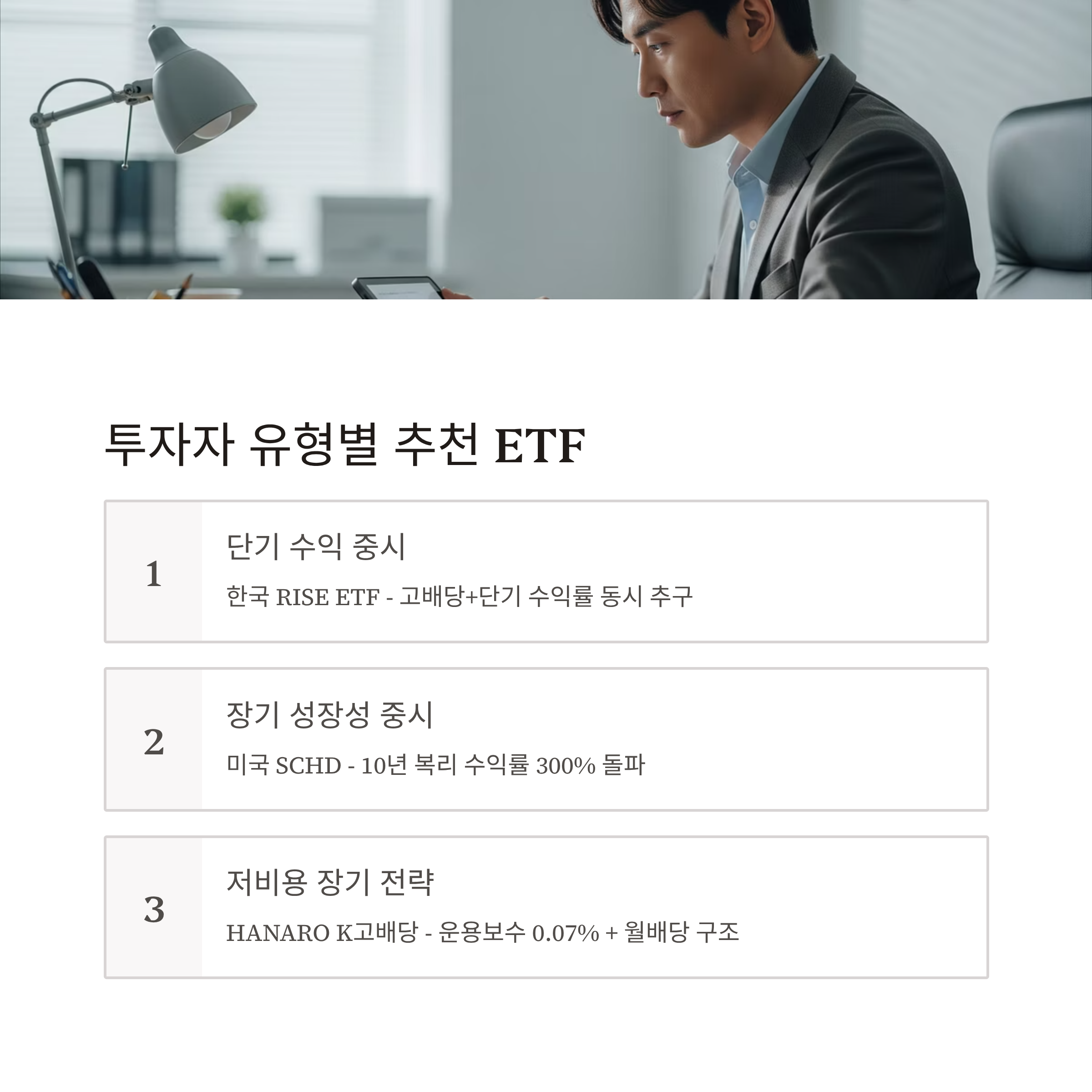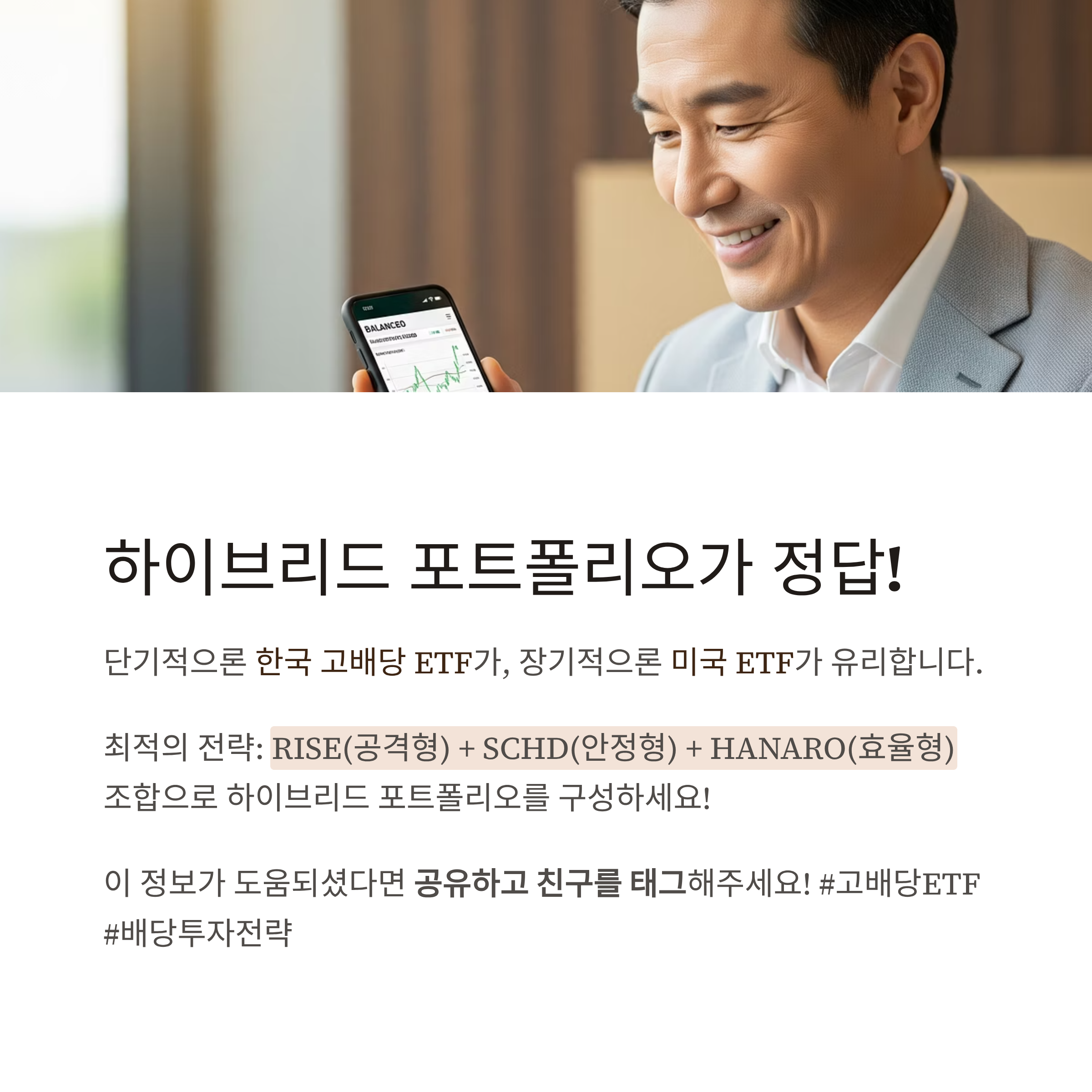 예: RISE (공격형) + SCHD (안정형) + HANARO K고배당 (세금 및 비용 효율형) 조합은 실전에서 매우 효과적인 구성입니다.