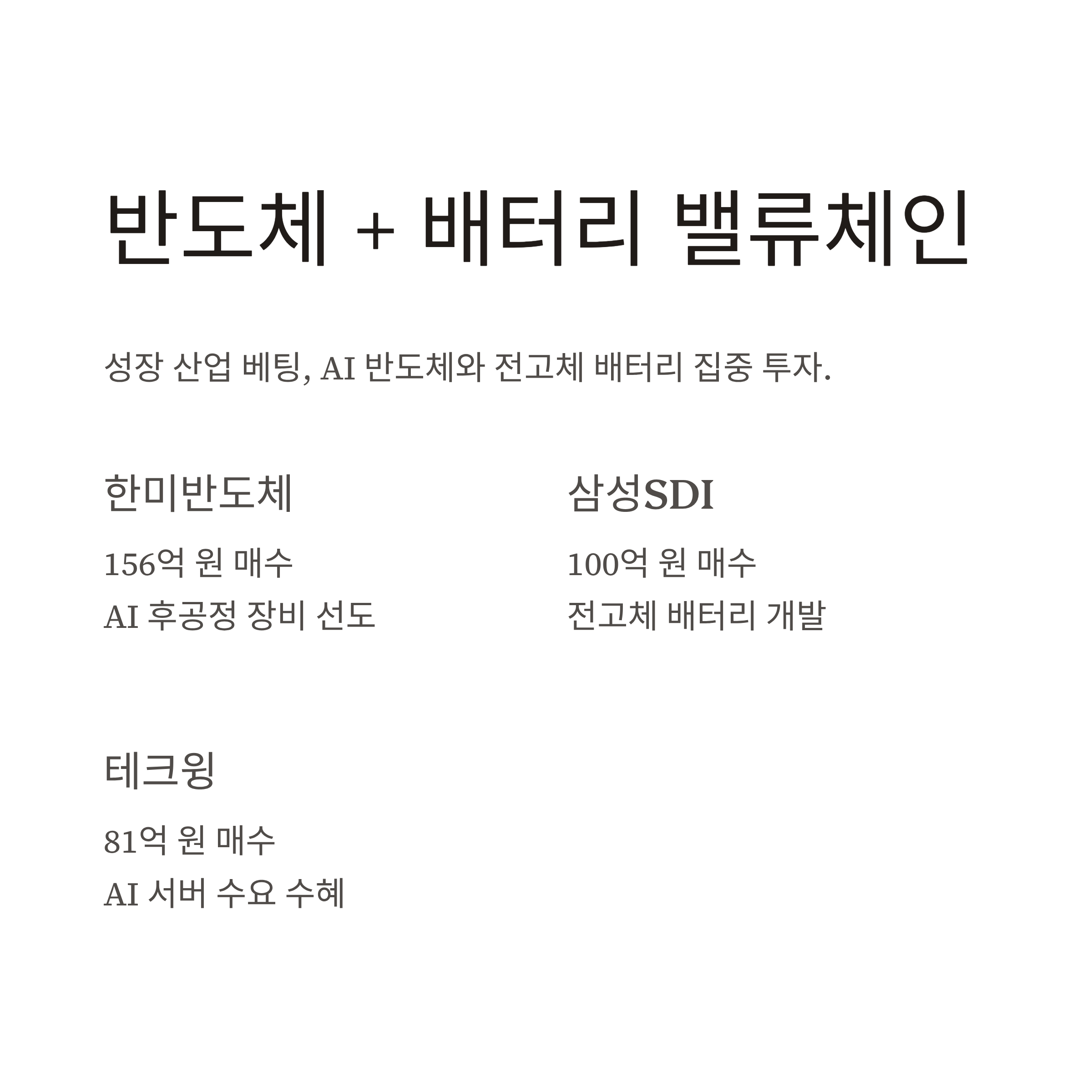 | 반도체 / 배터리 | 한미반도체, 삼성SDI, 테크윙 | AI 반도체 수요, 전고체 배터리 성장 기대 |