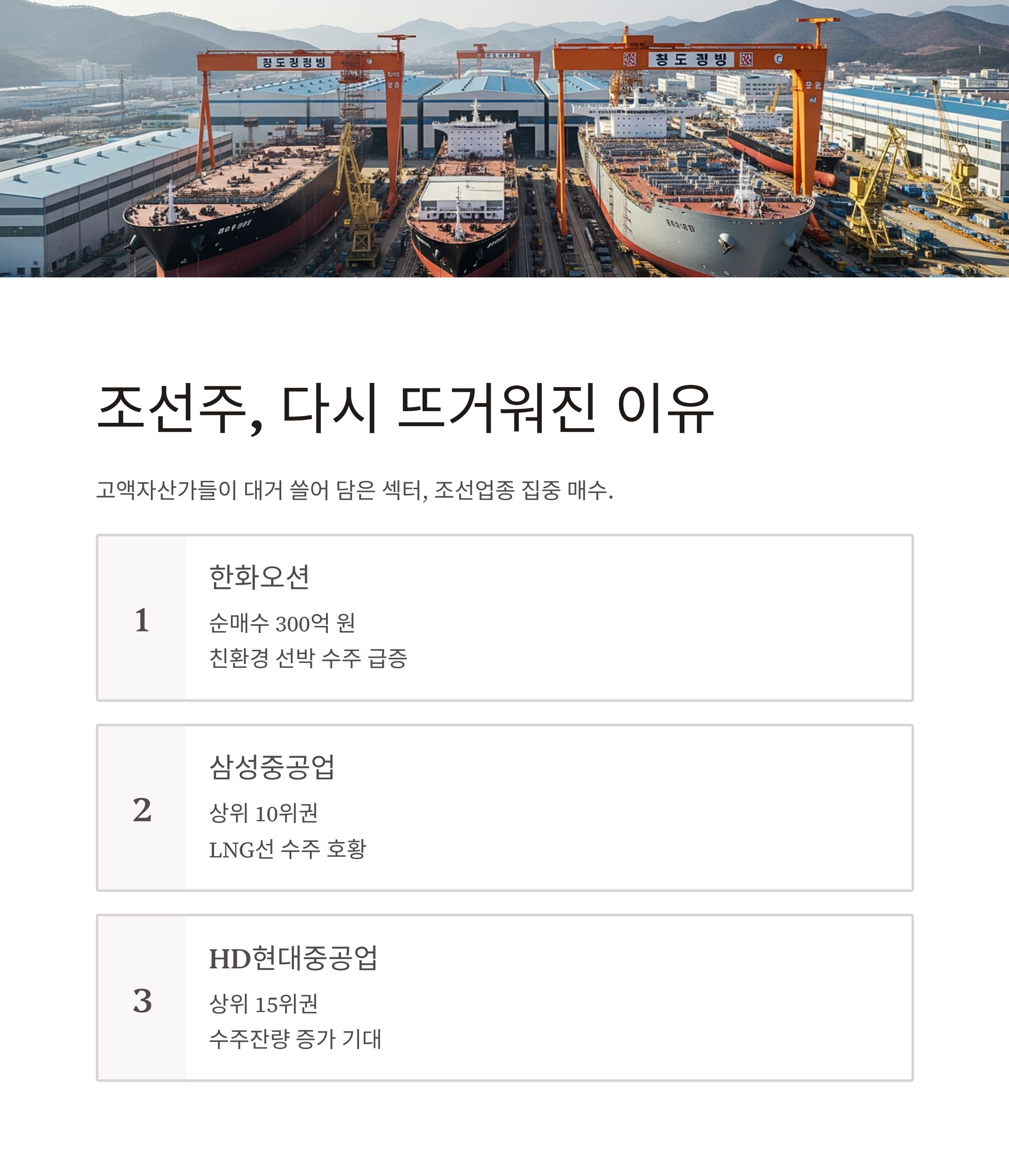 고액자산가들이 대거 쓸어 담은 섹터 중 하나는 바로 ‘조선업종’입니다.