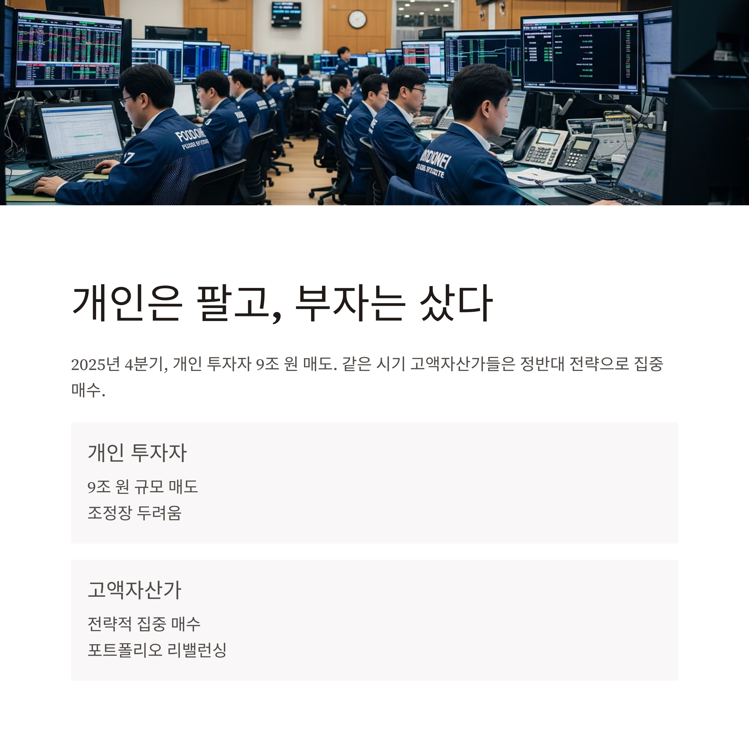 2025년 4분기, 개인 투자자들이 약 9조 원 규모의 주식을 팔아치웠습니다. 조정장에 대한 두려움, 차익 실현, 불확실성 회피가 원인이었죠. 그런데 같은 시기, 고액자산가들은 정반대 전략을 구사하며 오히려 특정 종목을 집중 매수했습니다. 정보력, 유동성, 분석력을 기반으로 한 이들의 매매는 단순한 ‘역발상’이 아니라 전략적 포트폴리오 리밸런싱이었죠.