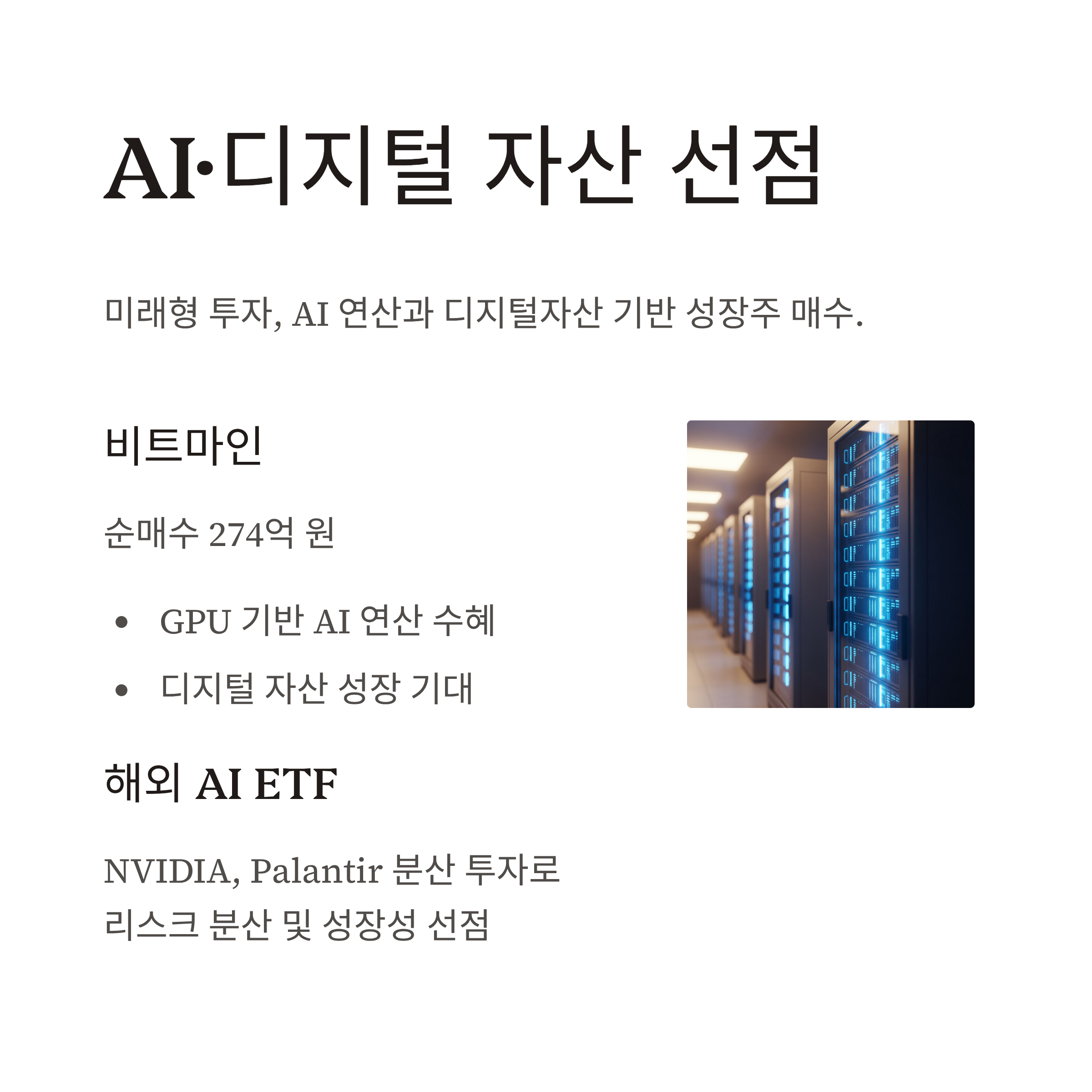 | 비트마인 | 약 274억 원 | GPU 기반 AI 연산 수혜 + 디지털 자산 기반 성장 기대 |