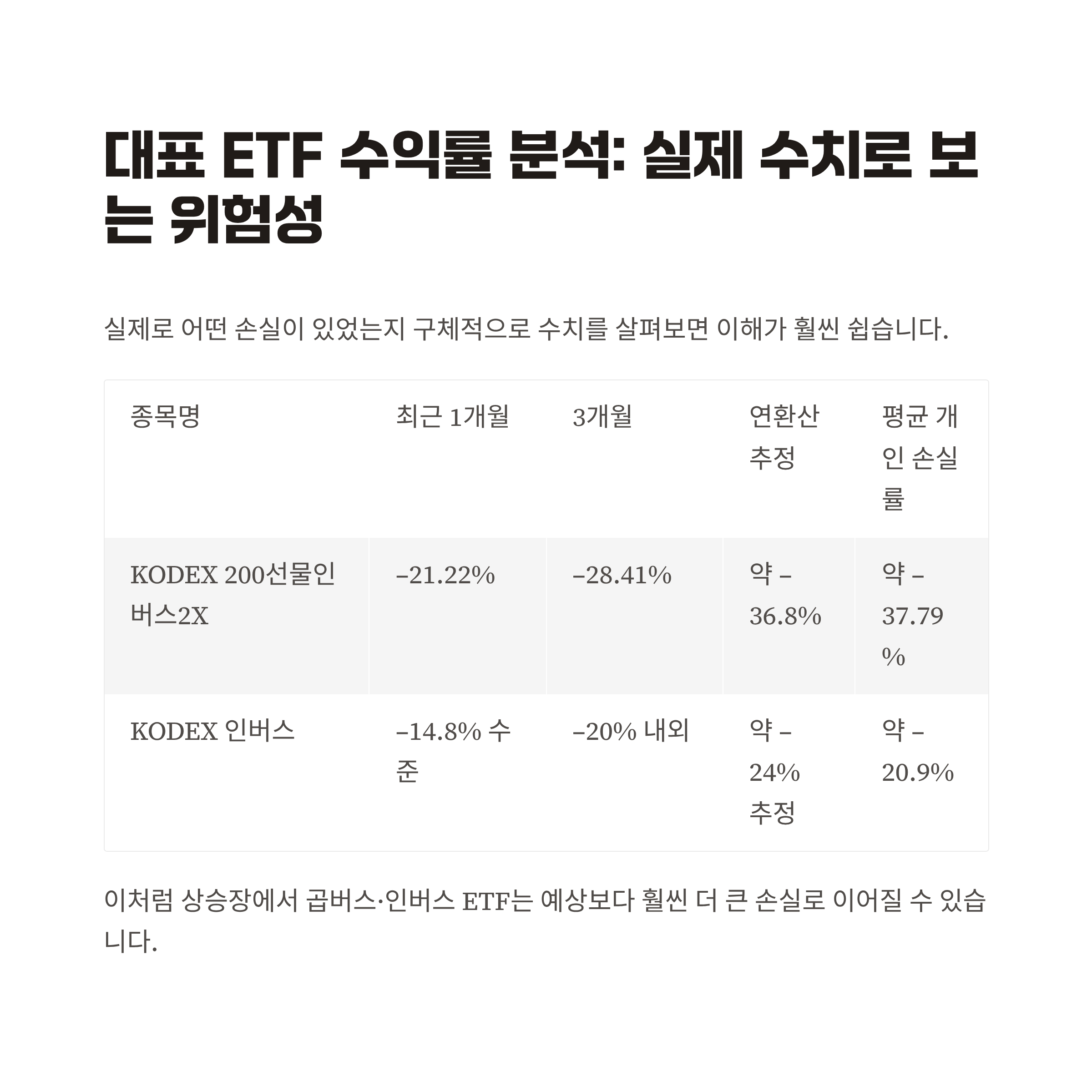 이처럼 상승장에서 곱버스·인버스 ETF는 예상보다 훨씬 더 큰 손실로 이어질 수 있습니다.