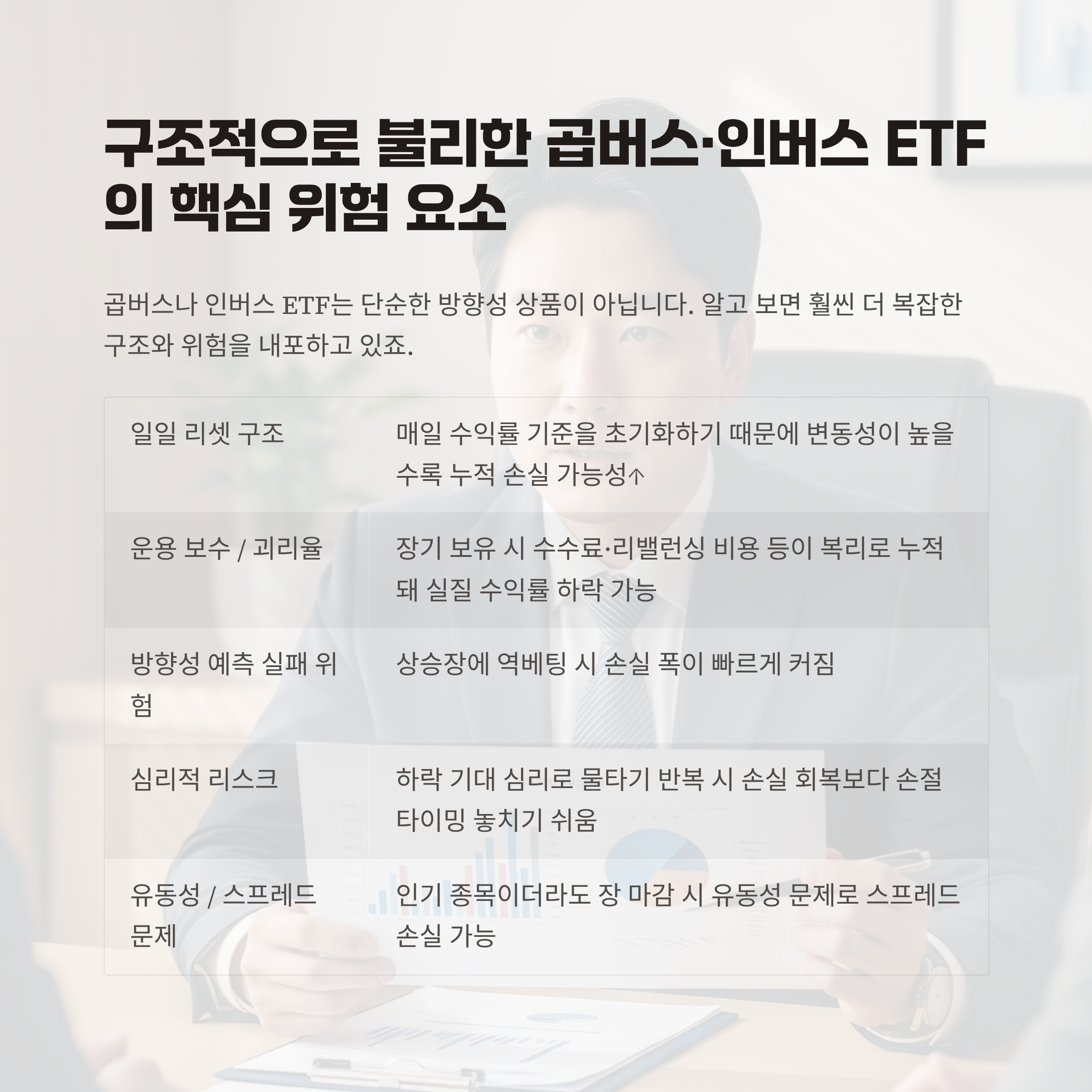 곱버스나 인버스 ETF는 단순한 방향성 상품이 아닙니다. 알고 보면 훨씬 더 복잡한 구조와 위험을 내포하고 있죠.