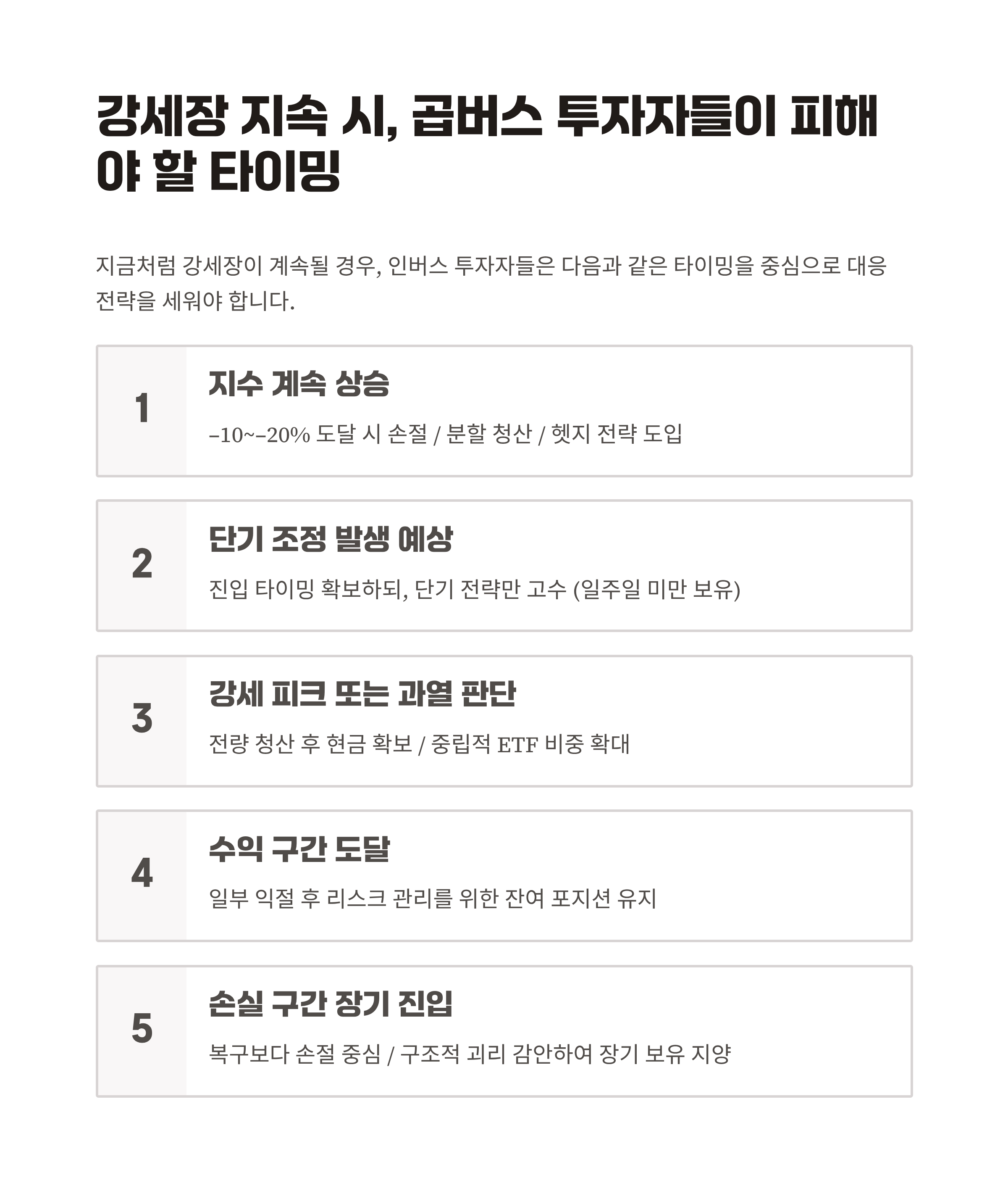 지금처럼 강세장이 계속될 경우, 인버스 투자자들은 다음과 같은 타이밍을 중심으로 대응 전략을 세워야 합니다.