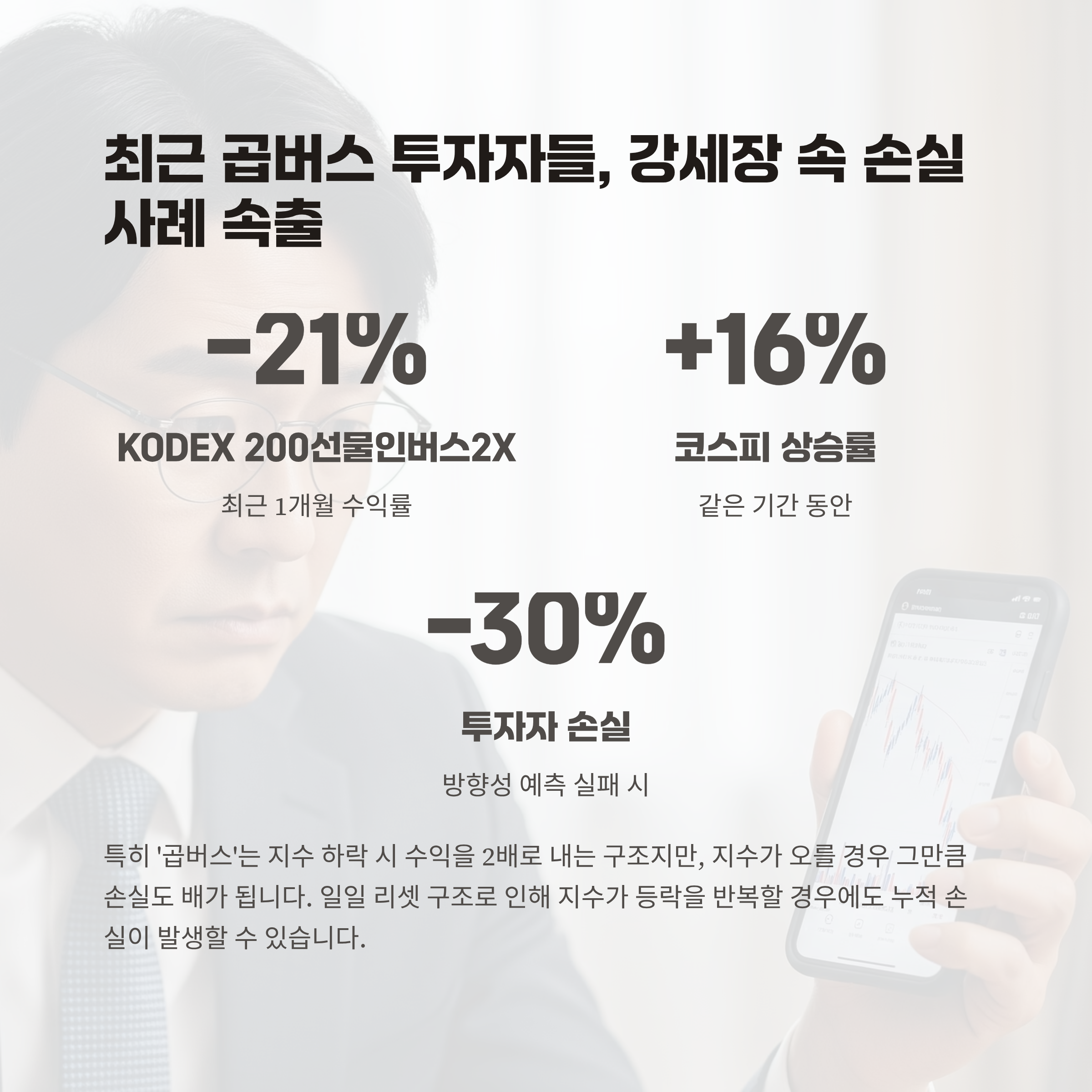 최근 1개월간 대표 종목인 KODEX 200선물인버스2X는 –21% 수준의 수익률을 기록했으며, 같은 기간 코스피는 16% 이상 상승했습니다. 결과적으로 방향성 예측에 실패한 투자자들은 –30% 이상의 손실을 감내해야 했습니다.