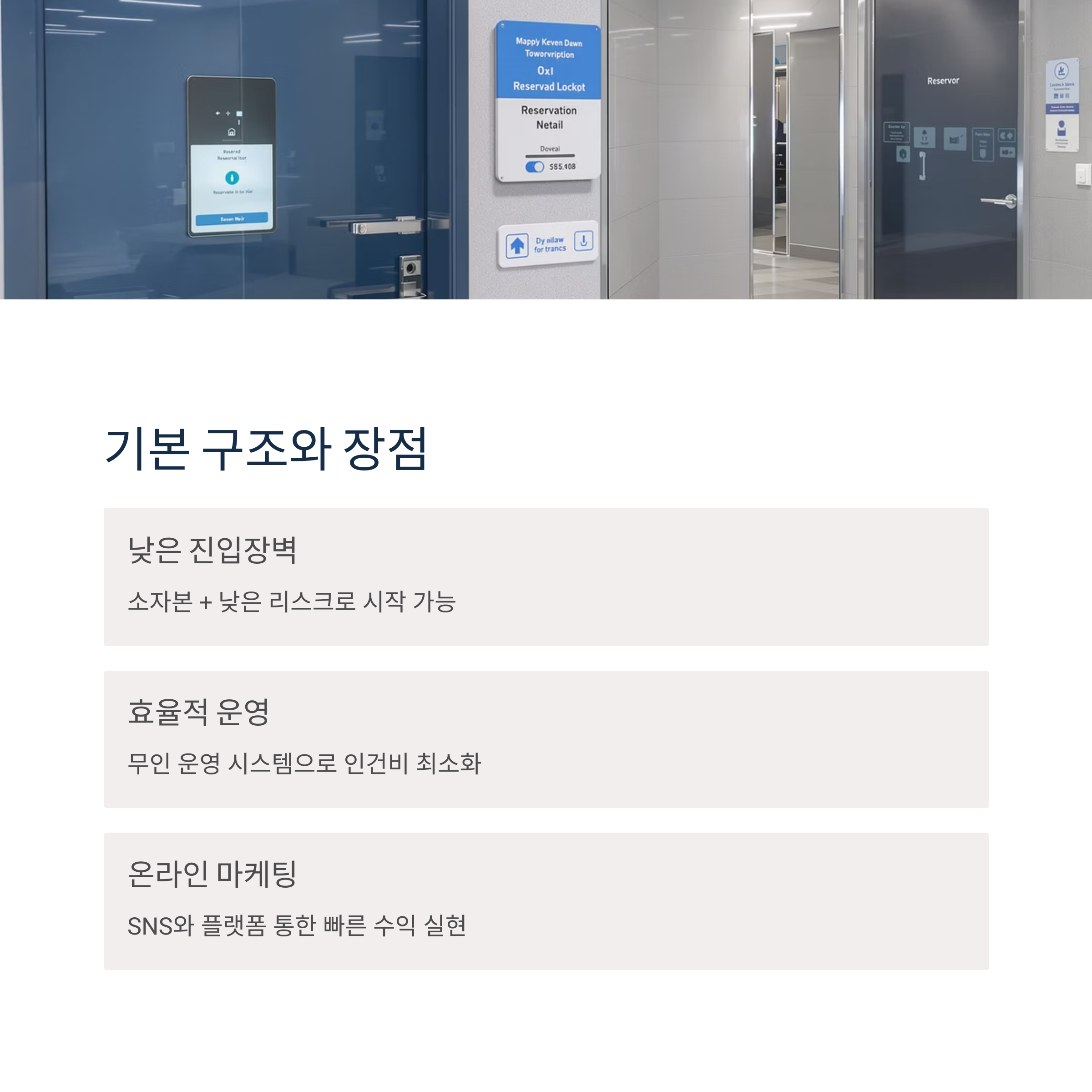 | 장점 | 건물 미소유자도 가능 / 온라인 기반 마케팅 / 인건비 최소화 |
