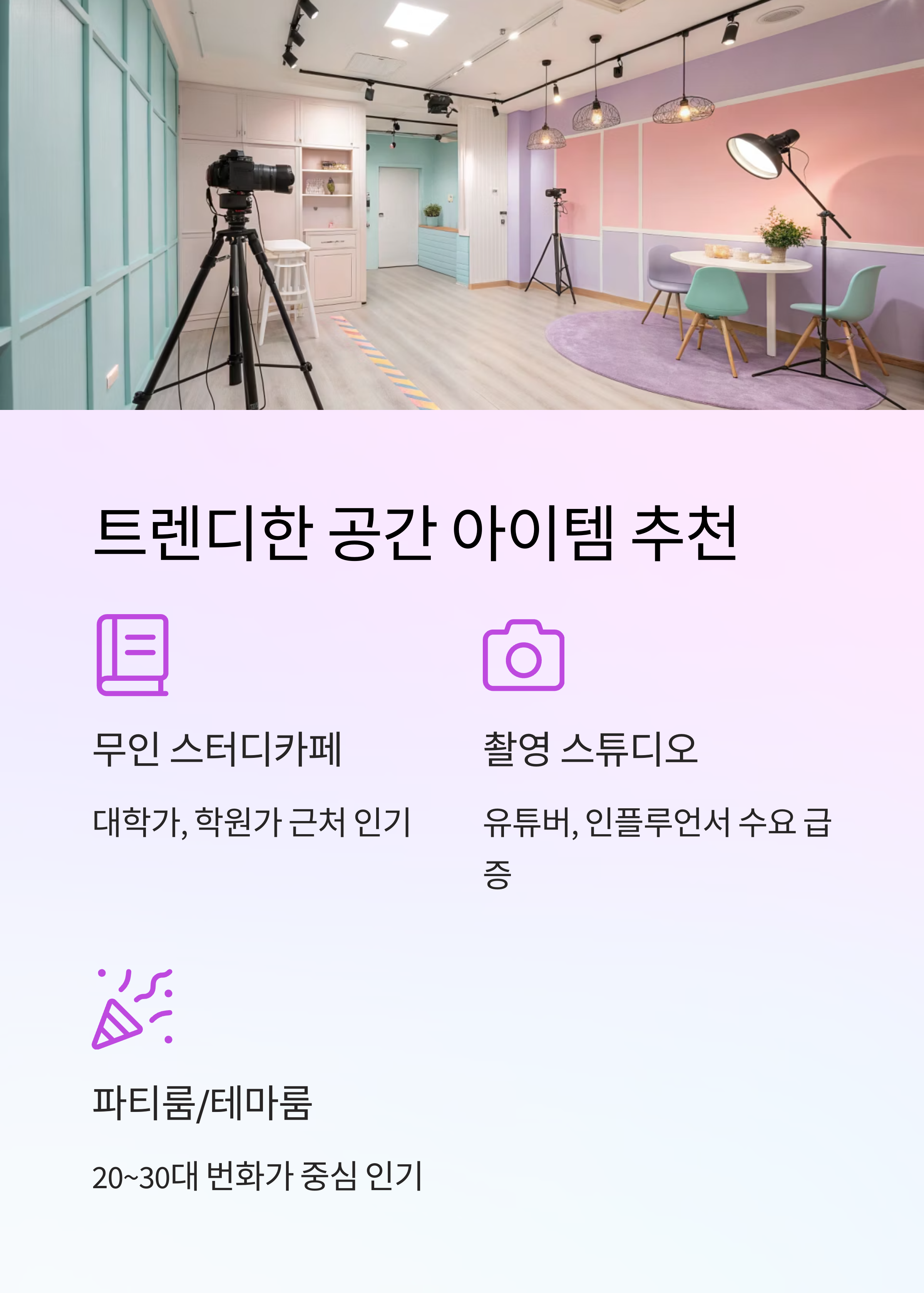 | 파티룸/보드게임룸 | 친구·연인끼리 모임 공간, 테마 인테리어 | 번화가, 20~30대 중심지 |