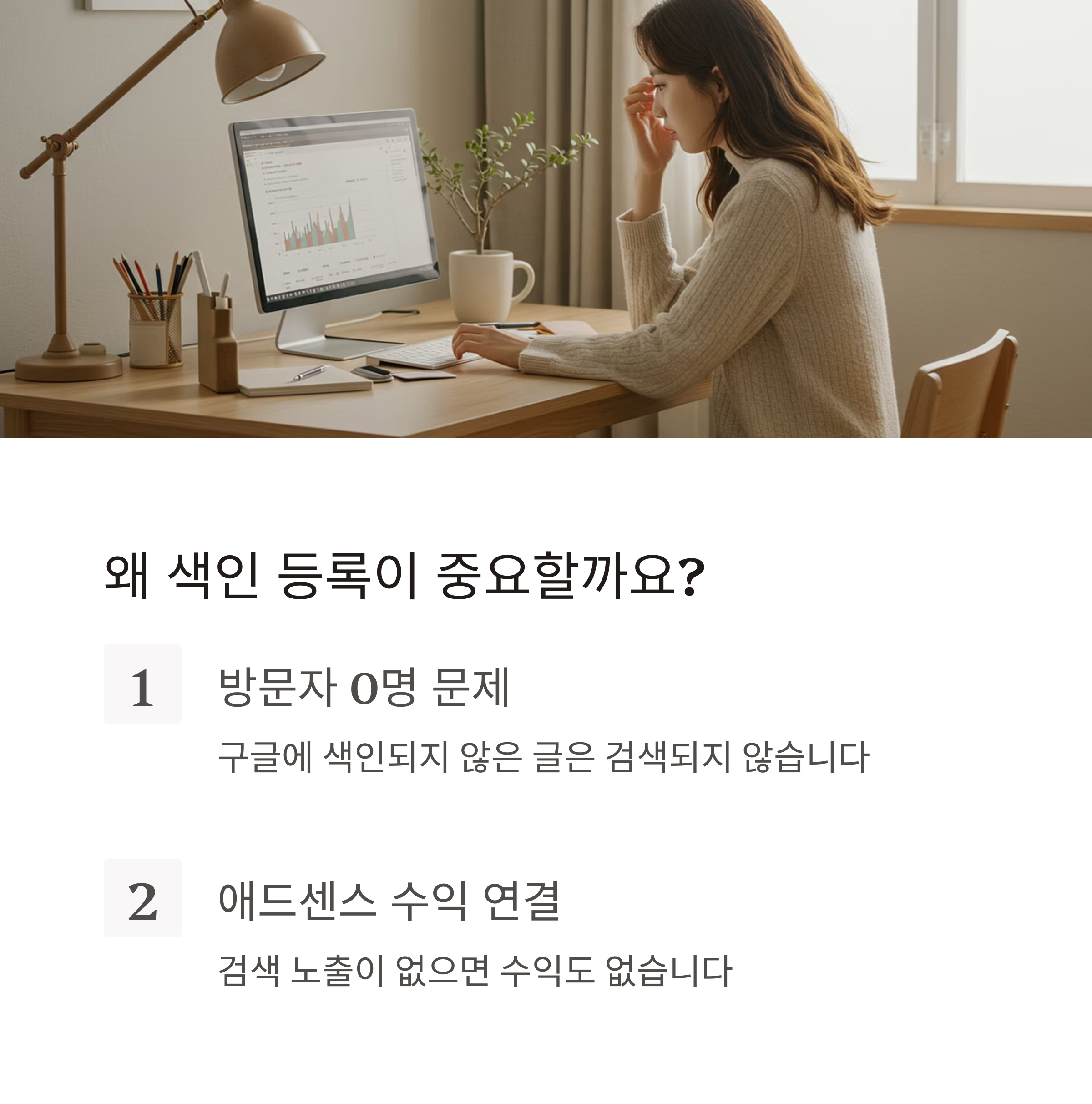 구글에서 글이 검색되지 않는다면 아무리 좋은 콘텐츠여도 방문자는 '0명', 수익도 당연히 없습니다.