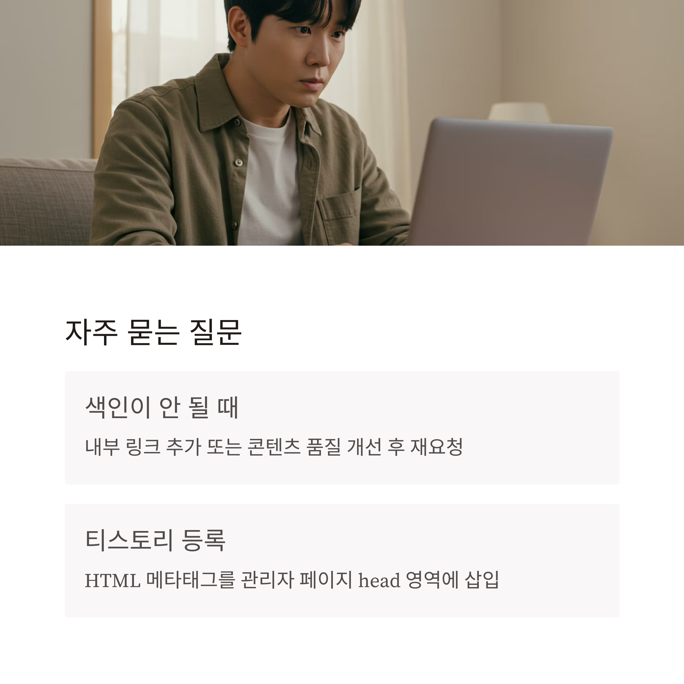 | 소유권 인증 | HTML 태그 방식 권장 (티스토리는 <head> 삽입) |