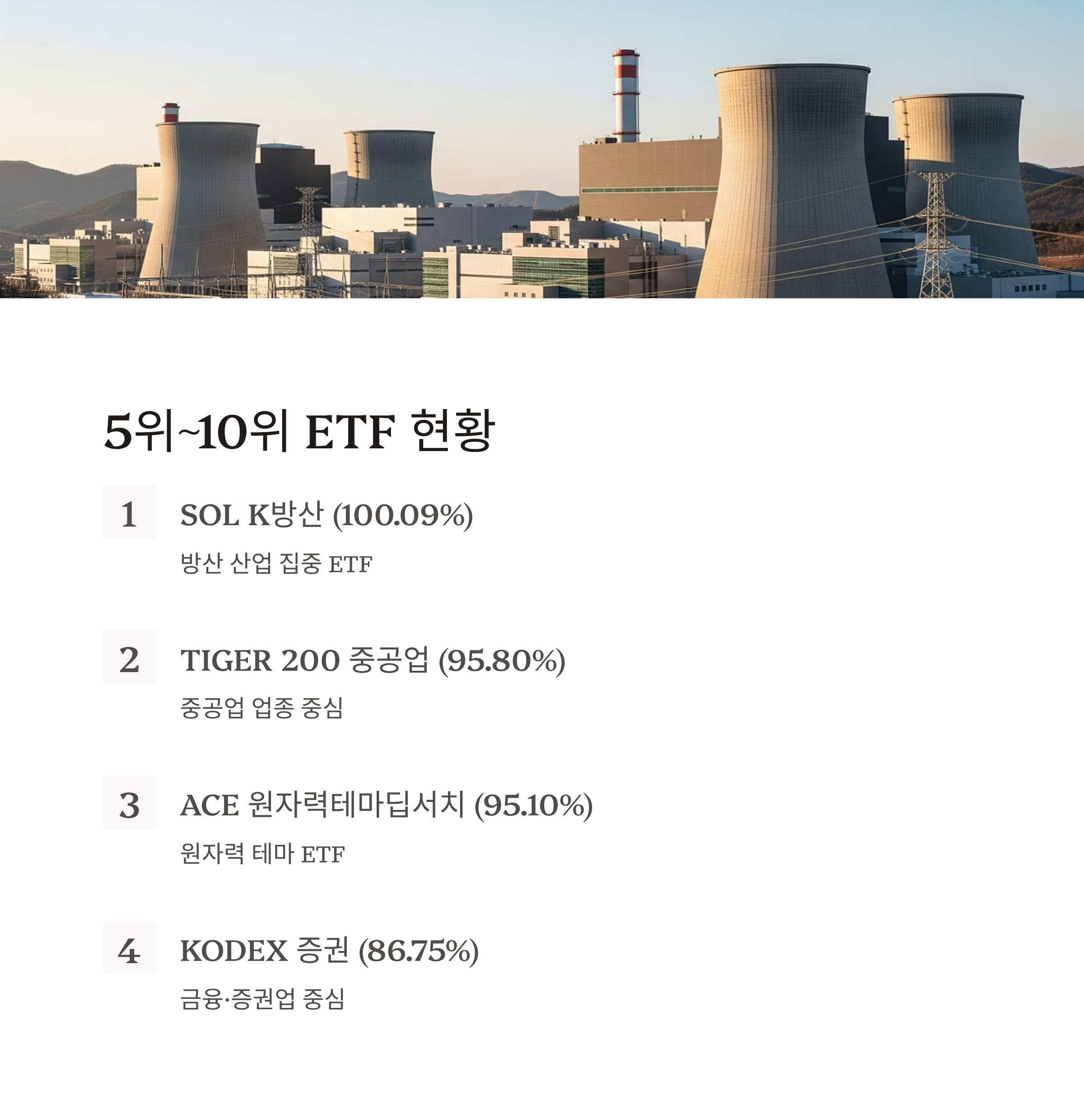 HANARO 원자력 iSelect, ACE 원자력테마딥서치가 나란히 순위권에 오르며 원자력 산업의 성장 기대가 반영되었습니다. 중공업·건설 ETF도 경기 회복과 정책 인프라 투자에 힘입어 강세를 보였습니다.