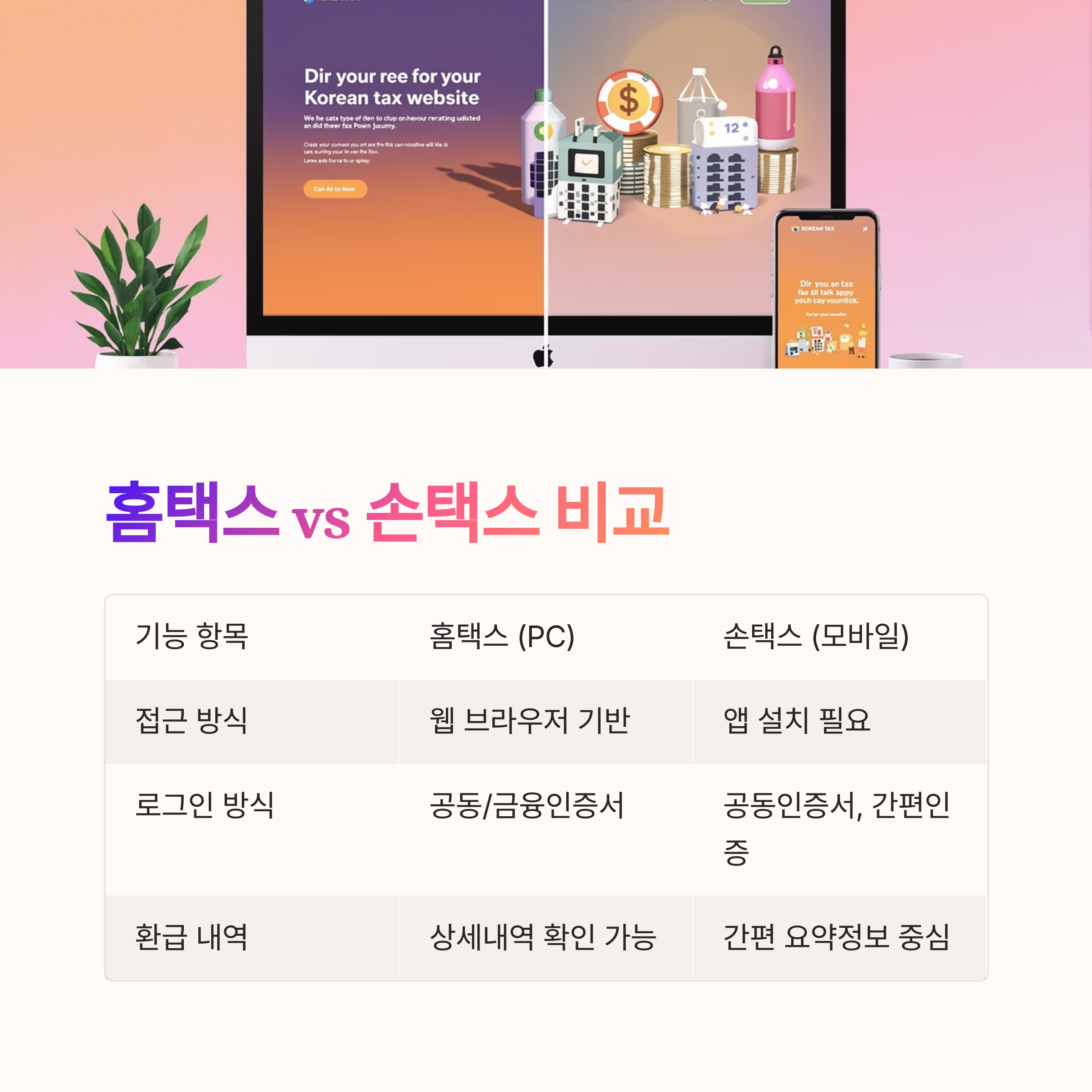 홈택스와 손택스는 각각 PC와 모바일에서 환급금 확인 및 신청을 지원하여