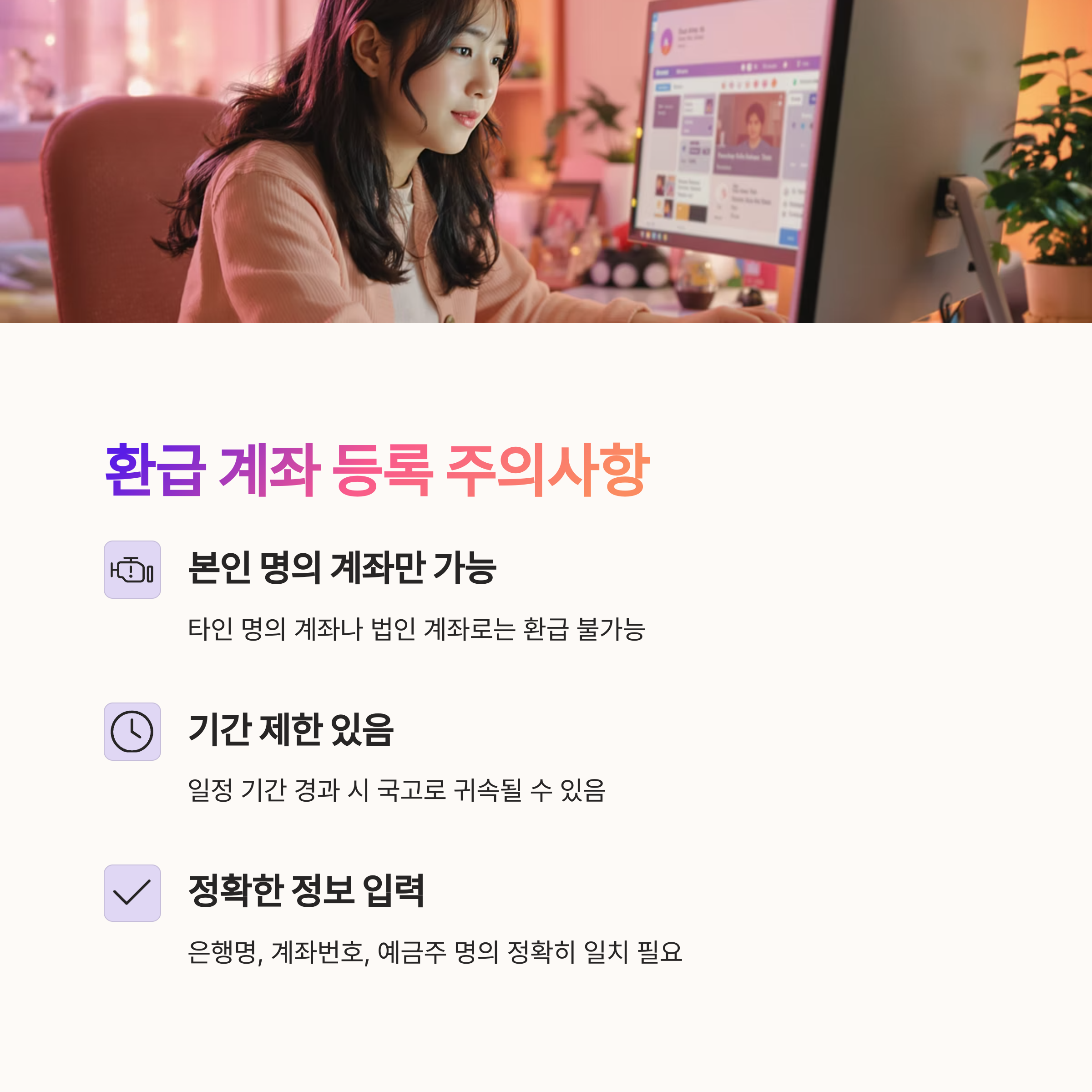 환급금은 계좌 미등록 시 수령할 수 없고, 일정 기간 경과 시 국고로 귀속될 수 있습니다.
