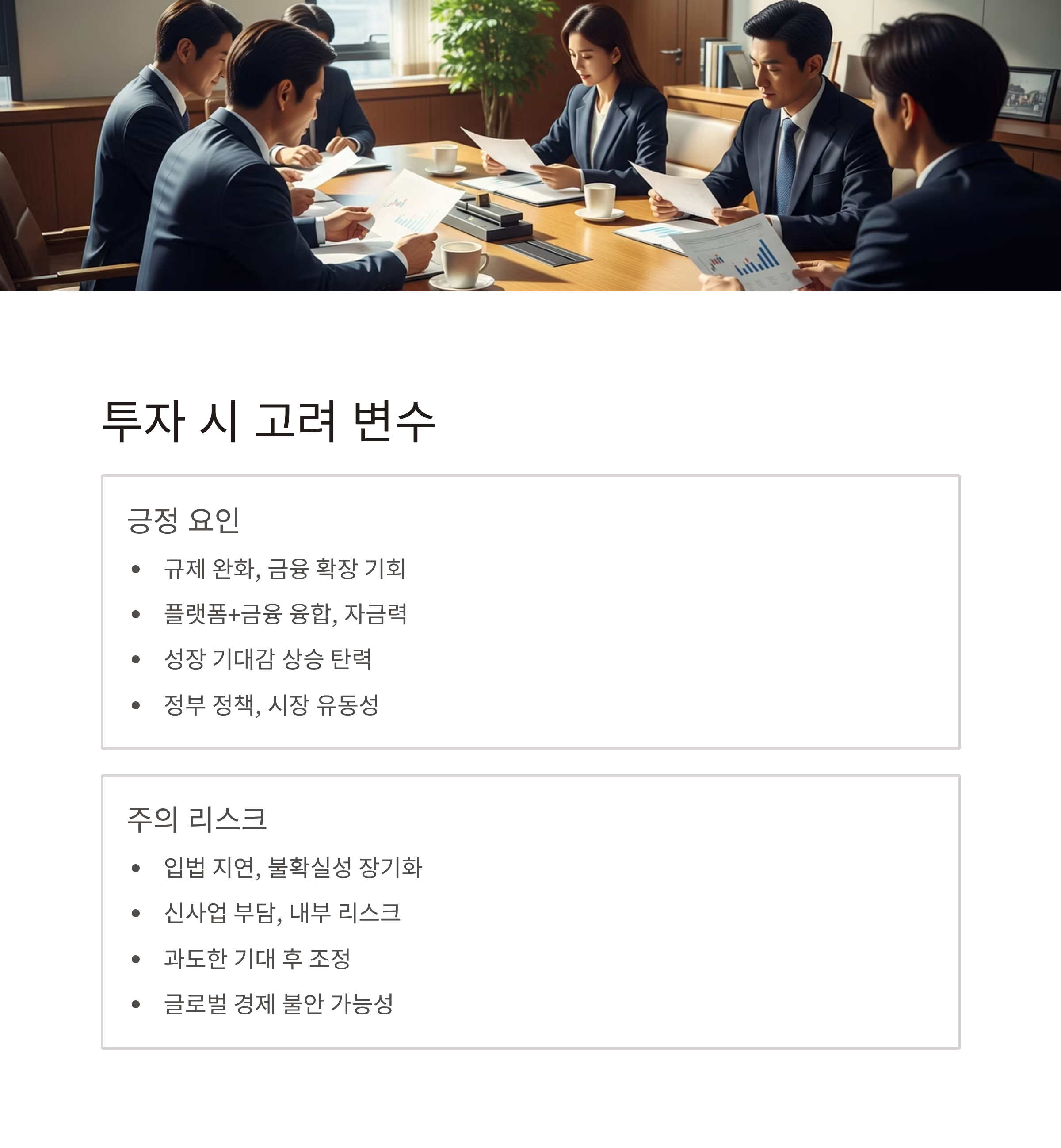 | 기업 역량 | 플랫폼+금융 융합, 자금력 보유 | 신사업 부담, 내부 리스크 |