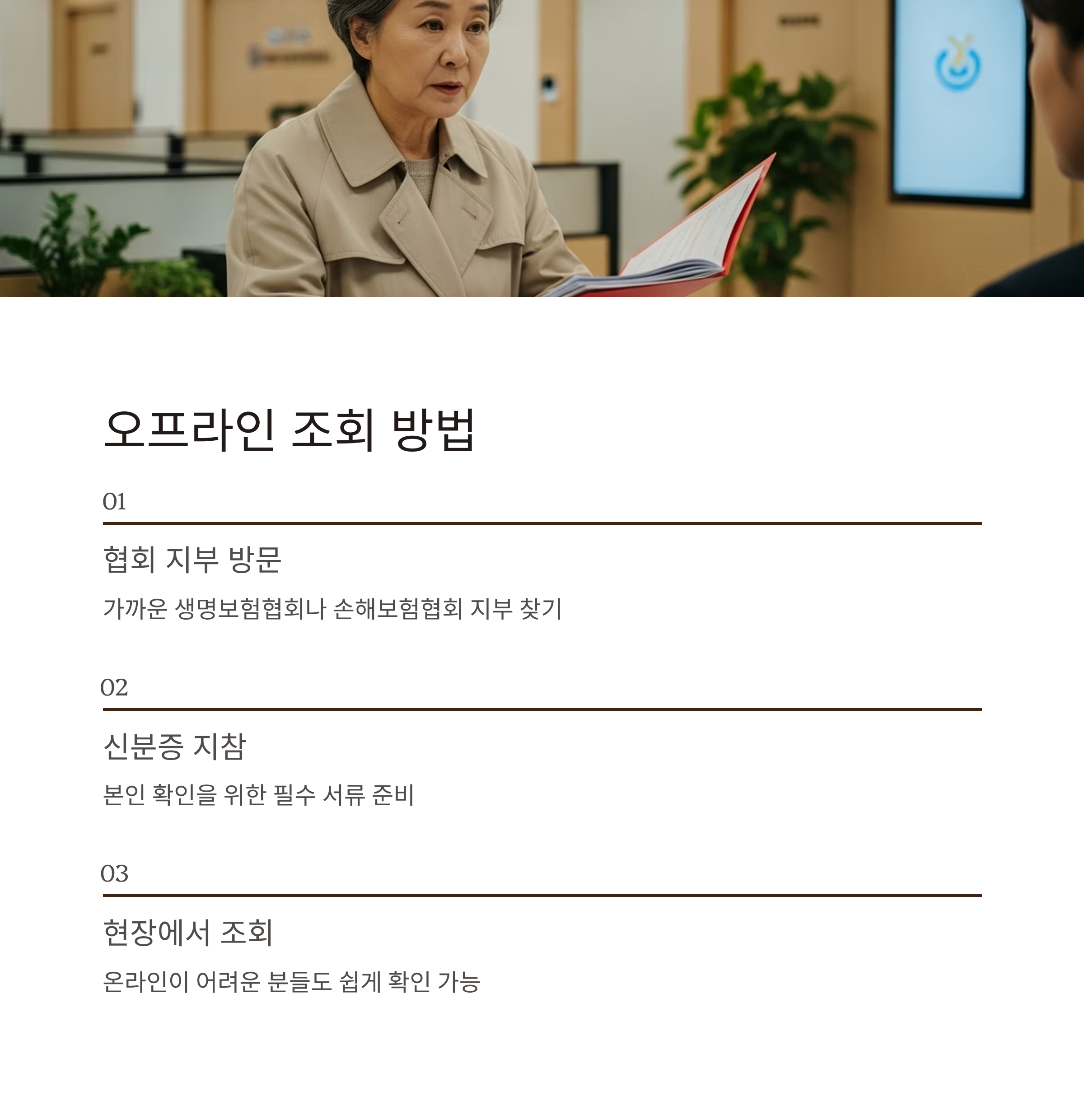 - 방법: 생명보험협회·손해보험협회 지부 방문 후 신분증과 필요 서류 제출 → 현장 조회 가능