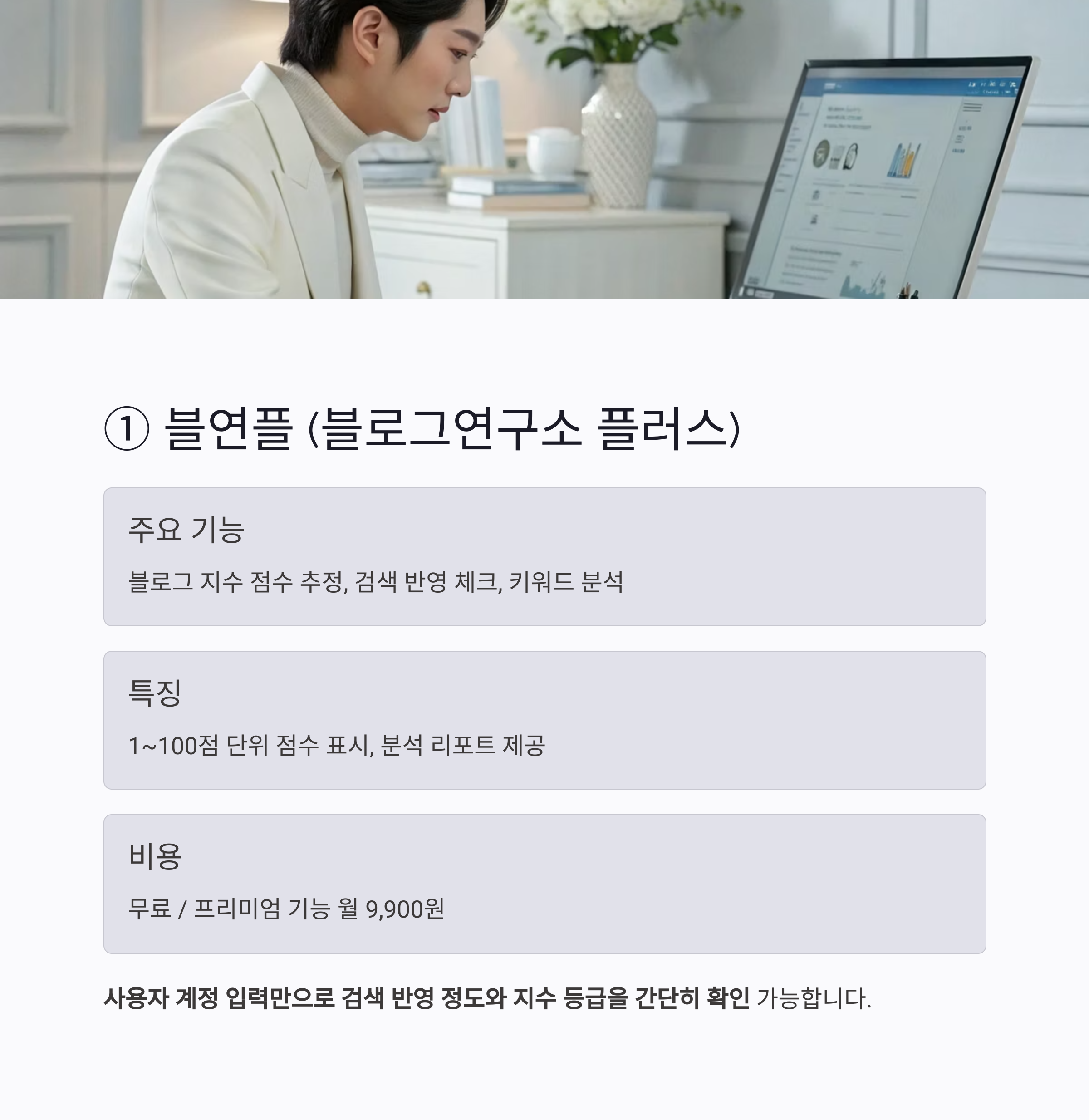 주요 기능 블로그 지수 진단, 채널 영향력 수치화, 통합 분석 리포트