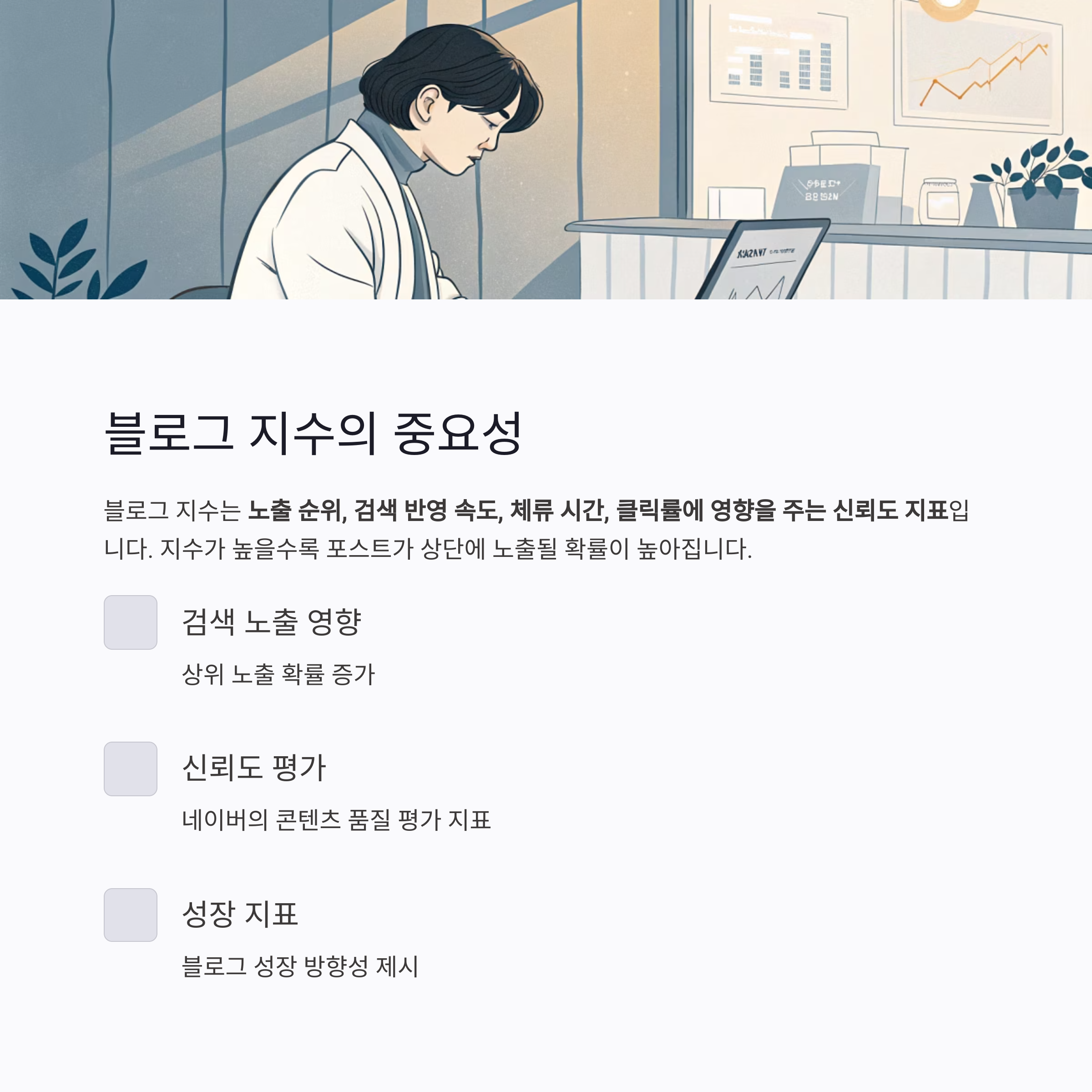 블로그 지수는 노출 순위, 검색 반영 속도, 체류 시간, 클릭률 등에 영향을 주는 신뢰도 지표로,