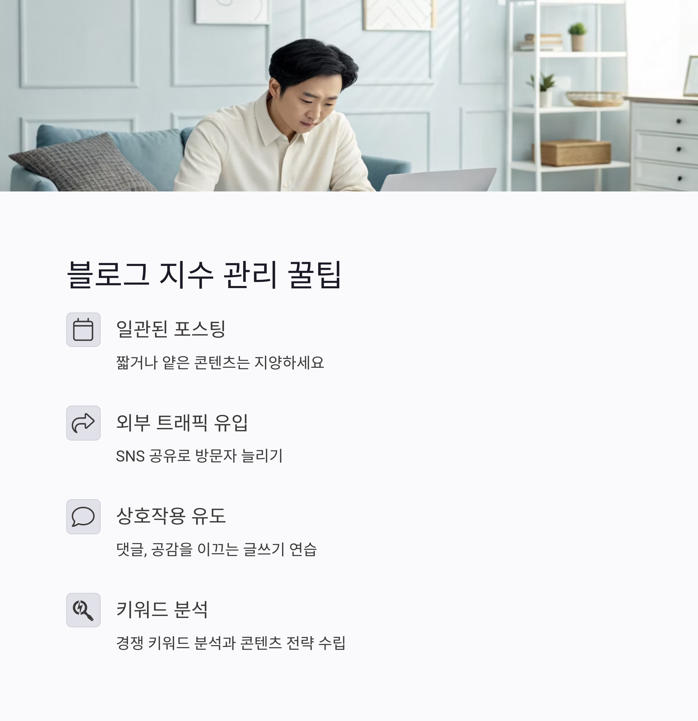 1. 포스팅은 일관되게, 지나치게 짧거나 얕은 콘텐츠는 지양