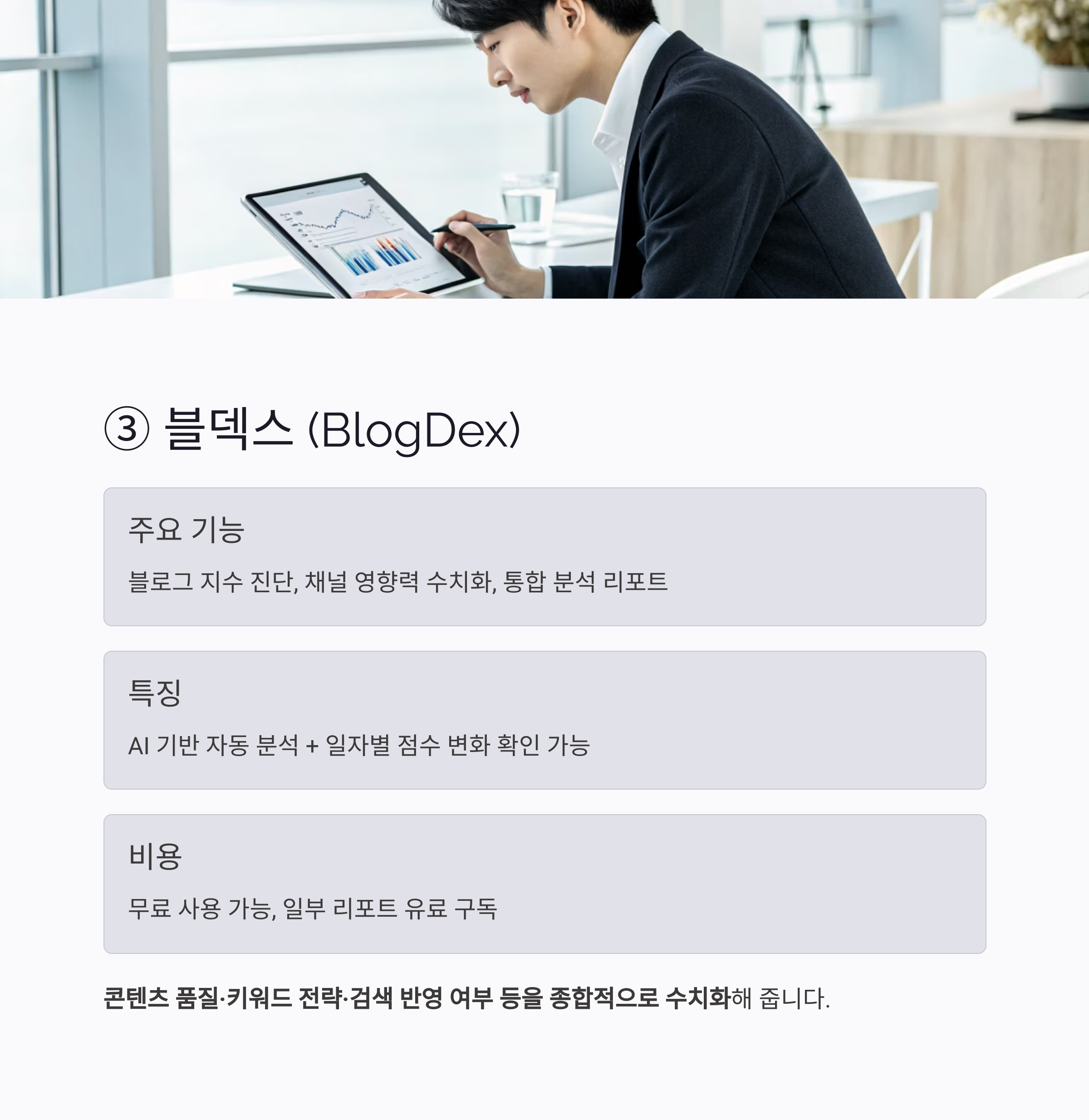 블덱스는 콘텐츠 품질·키워드 전략·검색 반영 여부 등을 종합적으로 수치화해주며,