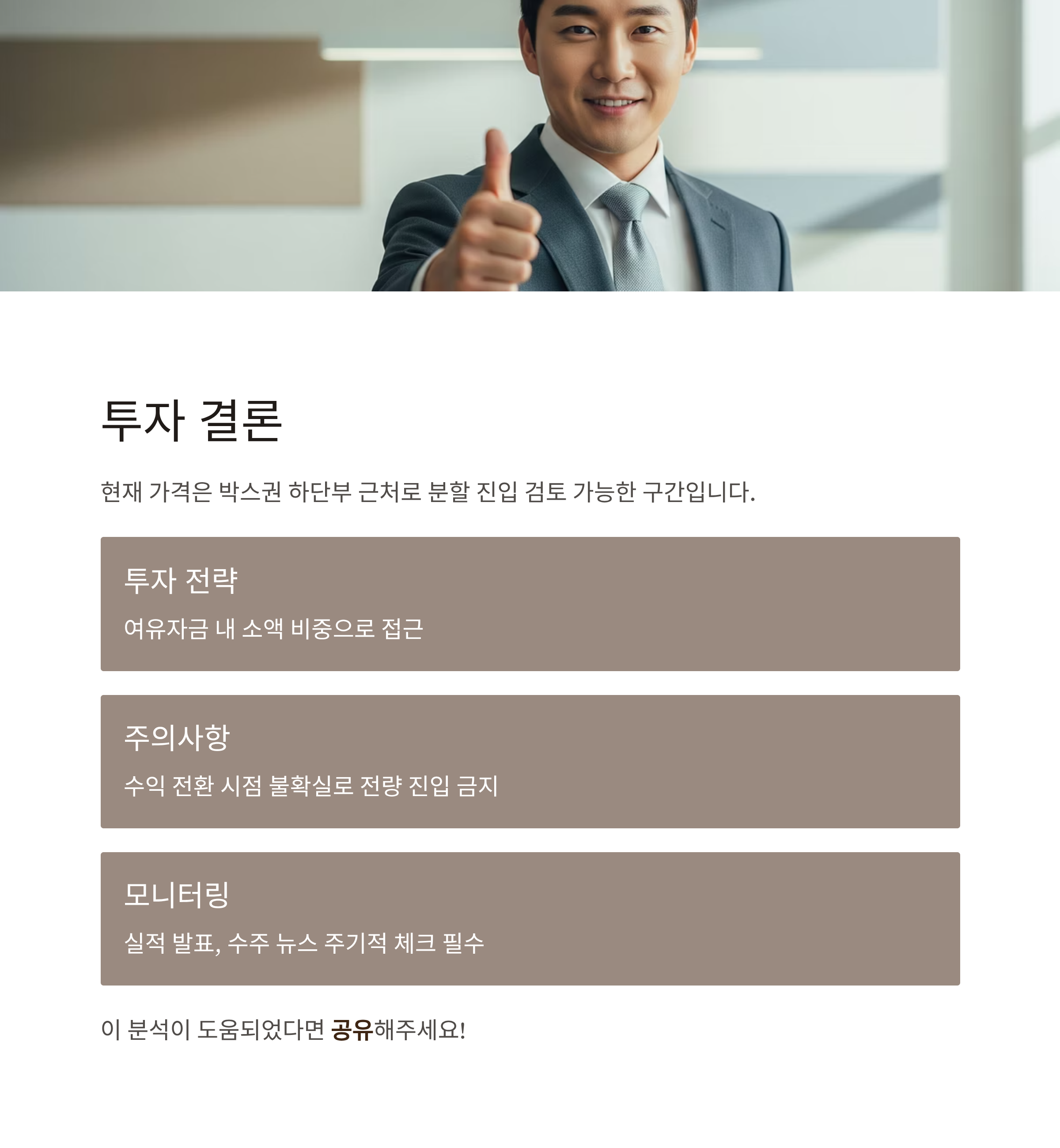 결론: 투자 여유자금 내 소액 비중으로 접근 가능 / 실적 발표 및 수주 뉴스 주기적 체크 필수