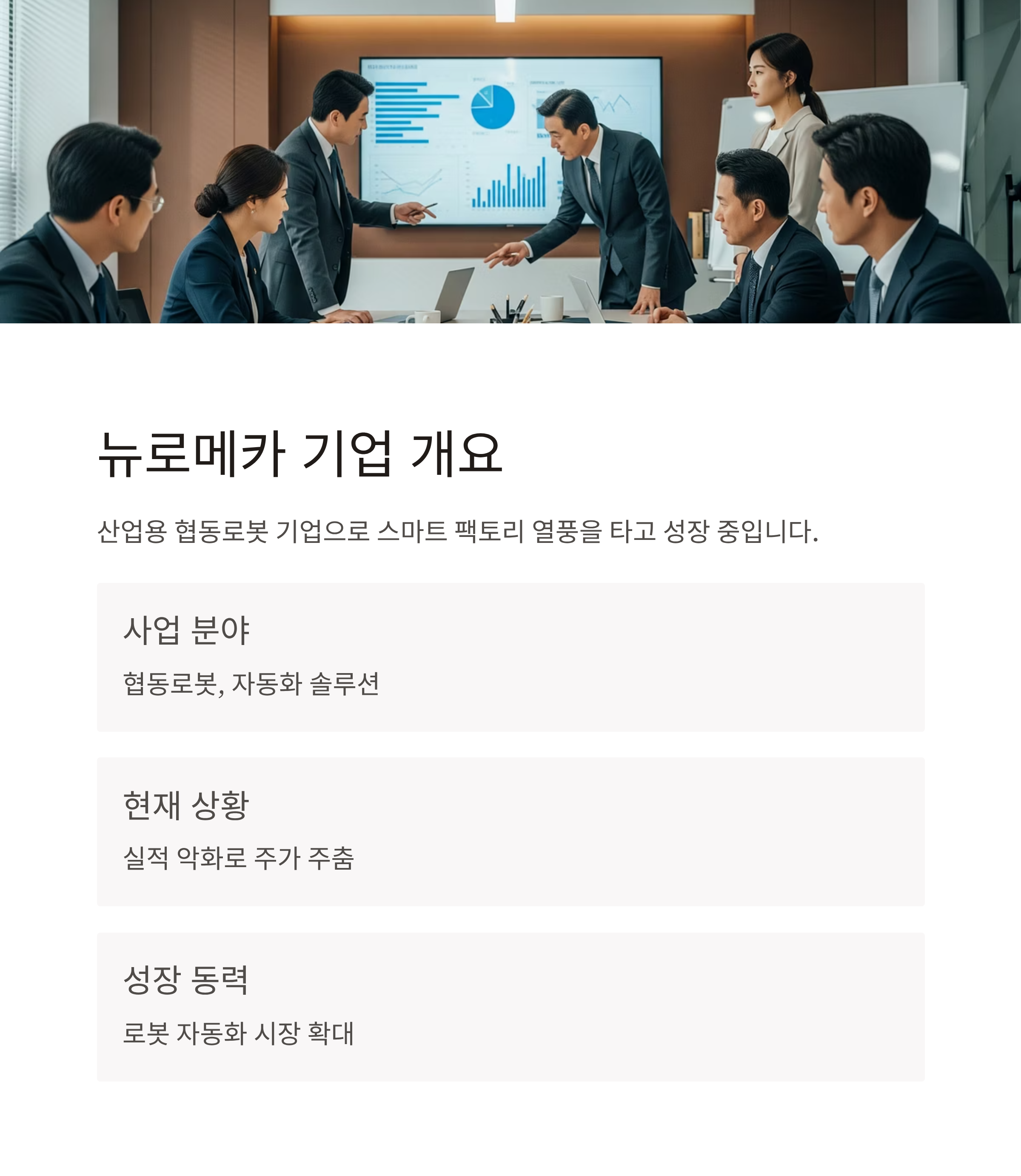 산업용 협동로봇 기업 뉴로메카(348340)는 ‘스마트 팩토리’와 ‘로봇 자동화’ 열풍을 타고 주목받고 있는 성장주입니다. 하지만 최근엔 실적 악화와 수익성 리스크로 주가가 주춤하고 있죠. 현재 가격은 과연 매수 타이밍일까요, 아니면 한 템포 더 지켜봐야 할 구간일까요?