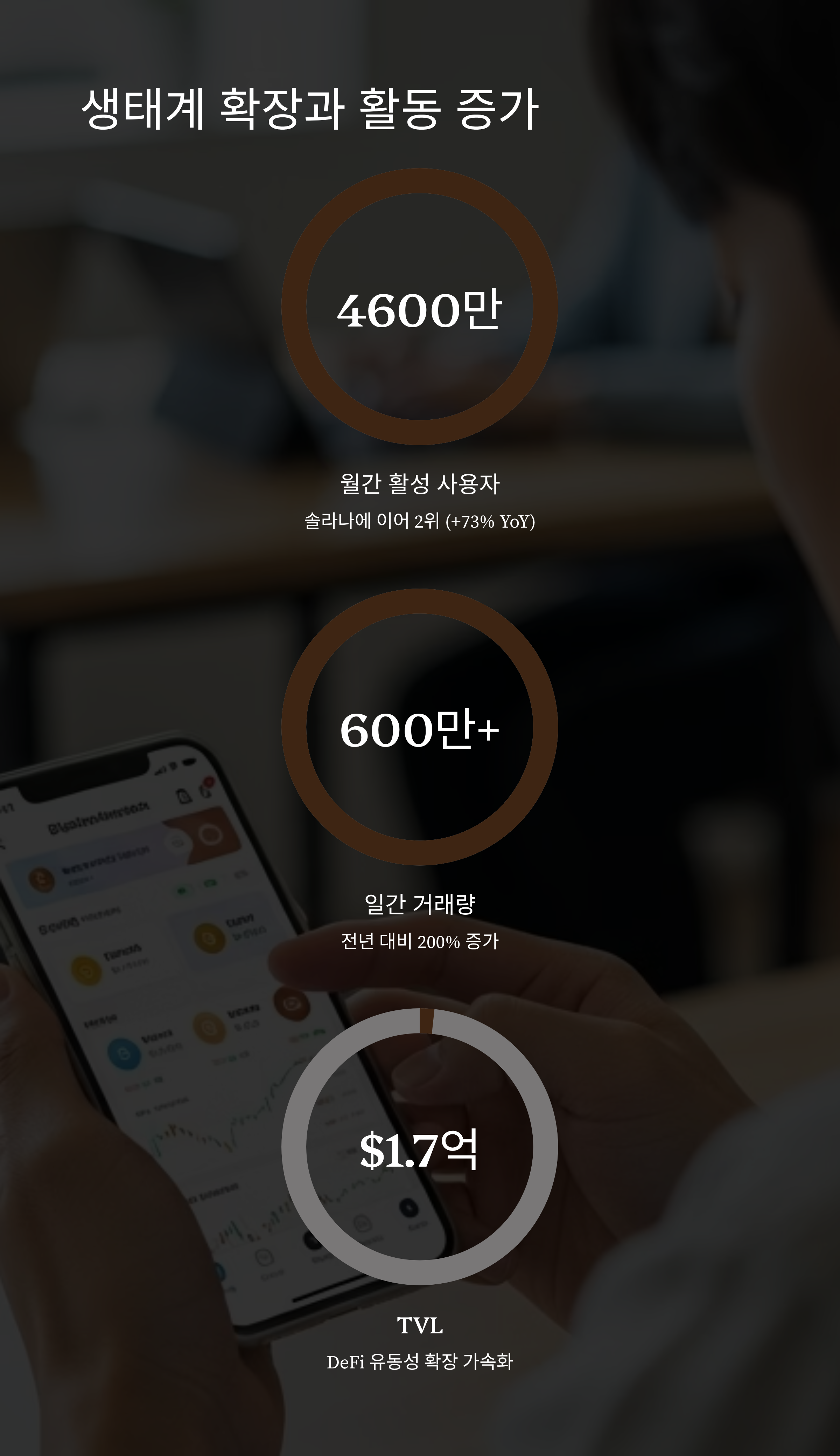 2025년 기준 월간 활성 사용자는 4,600만 명으로 솔라나에 이어 2위를 기록했으며,