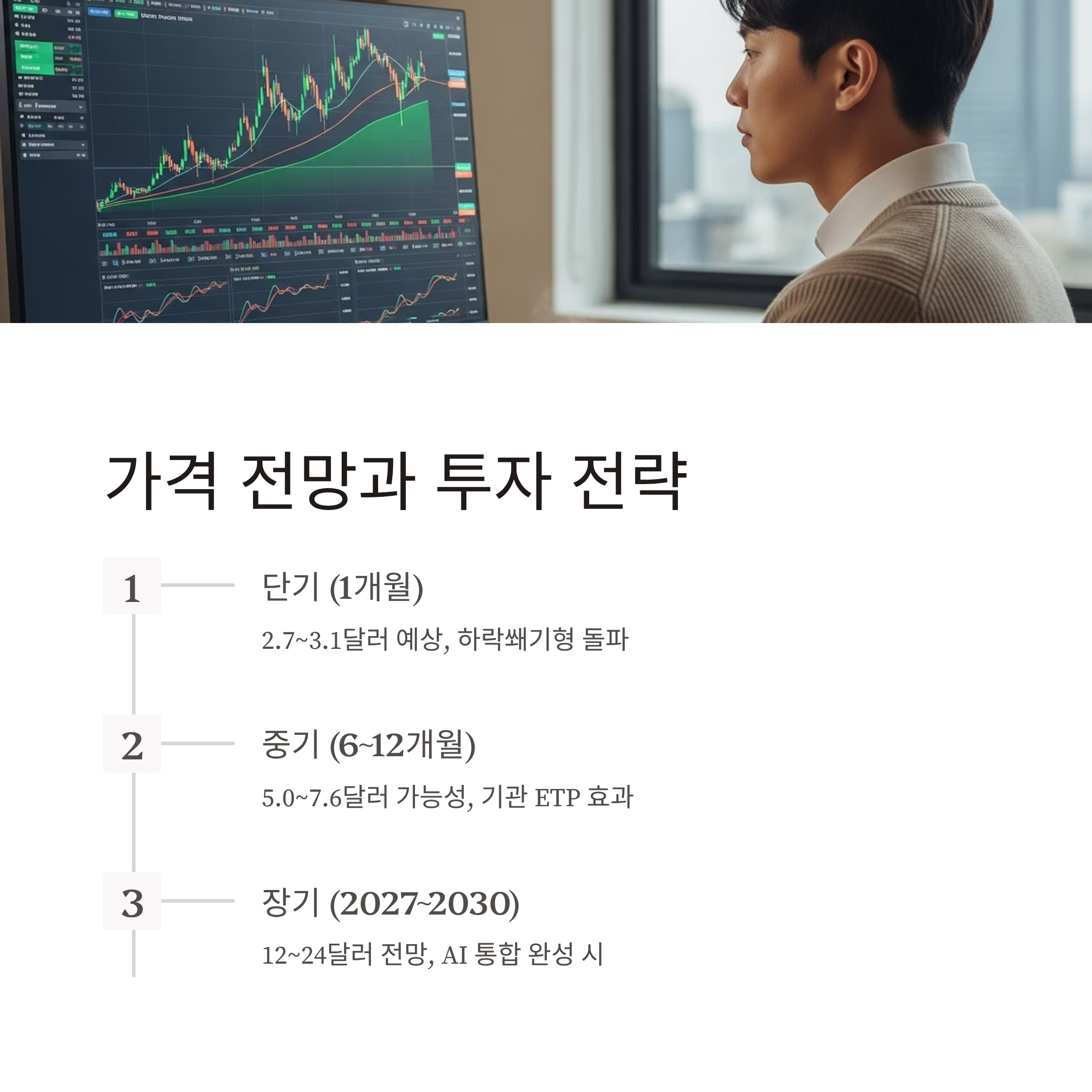 | 장기 (2027~2030) | 12~24달러 | AI 통합 + 토크노믹스 개선 |