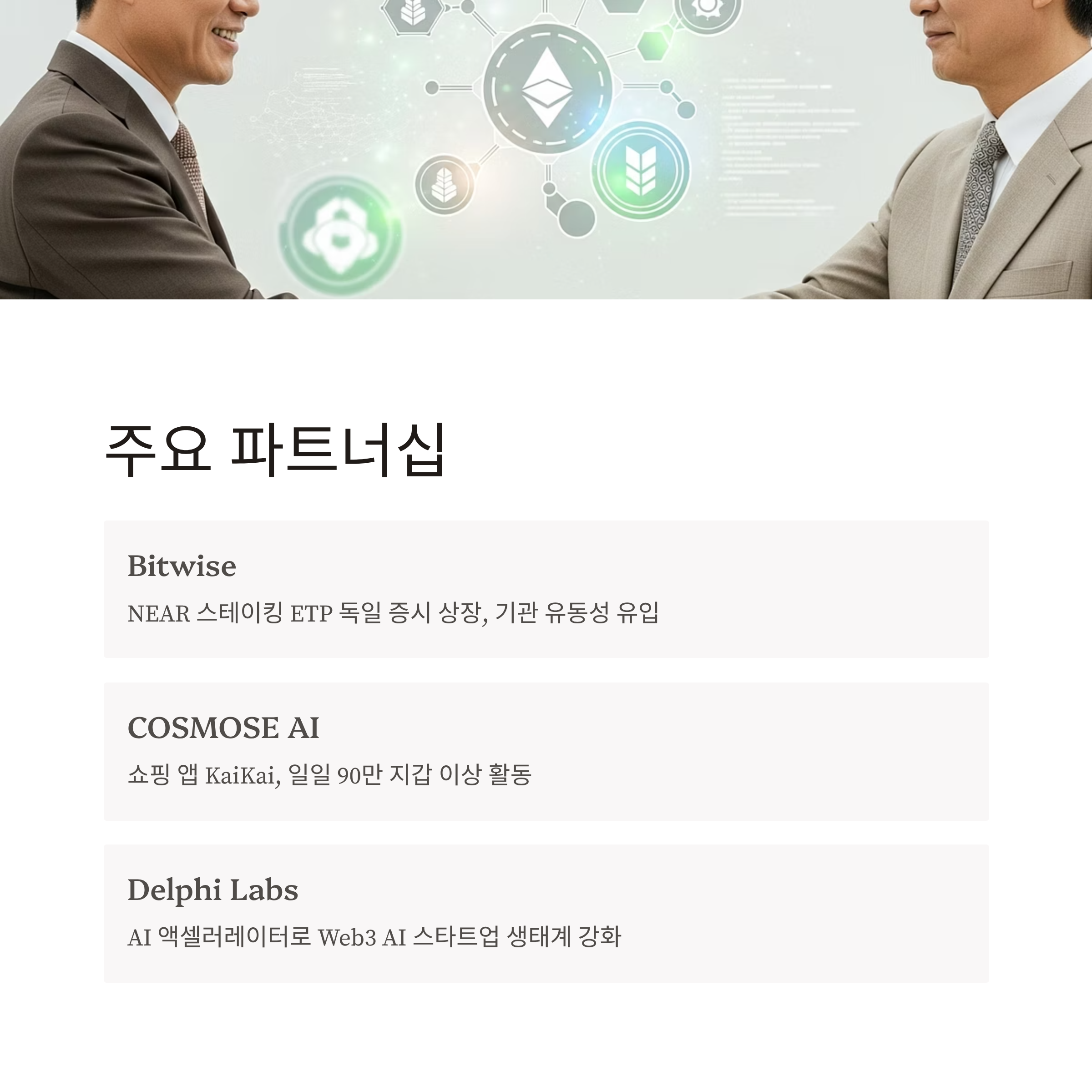 NEAR는 전략적 파트너십을 통해 기관 투자자와 실사용 프로젝트를 유치하고 있습니다.