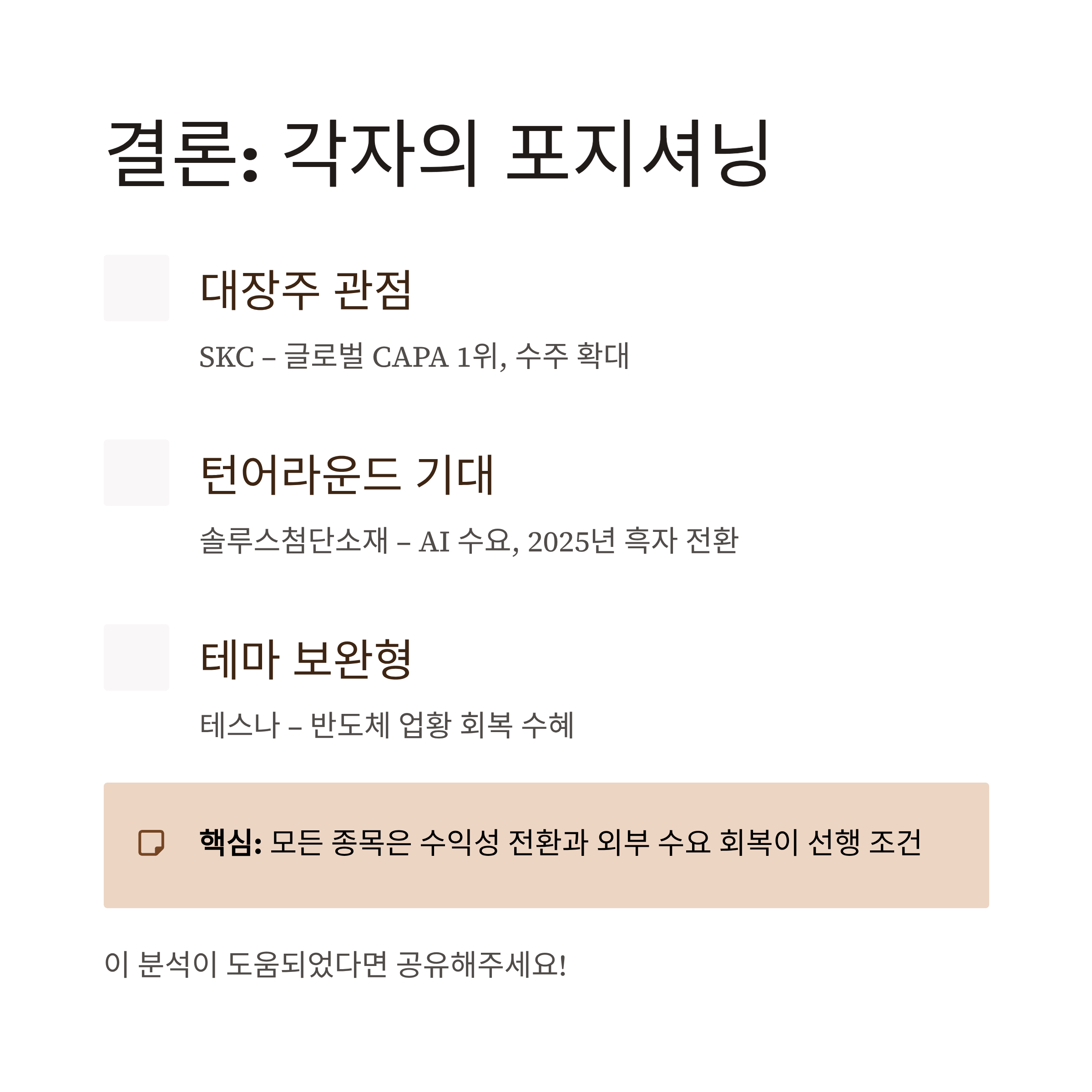 이 각각 포지셔닝되어 있다고 볼 수 있습니다. 단, 모든 종목은 수익성 전환과 외부 수요 회복이 선행 조건이라는 점을 반드시 유념해야 합니다.