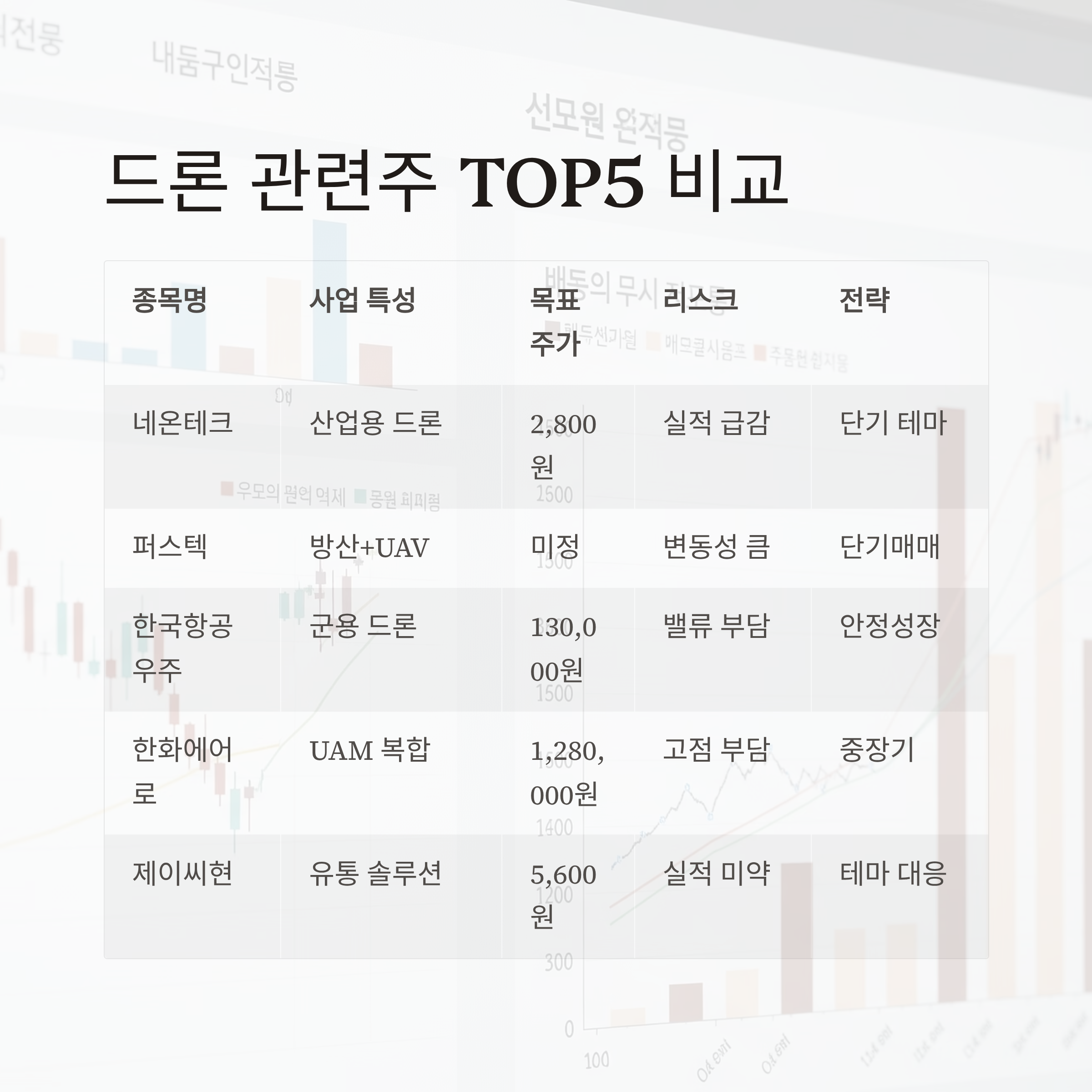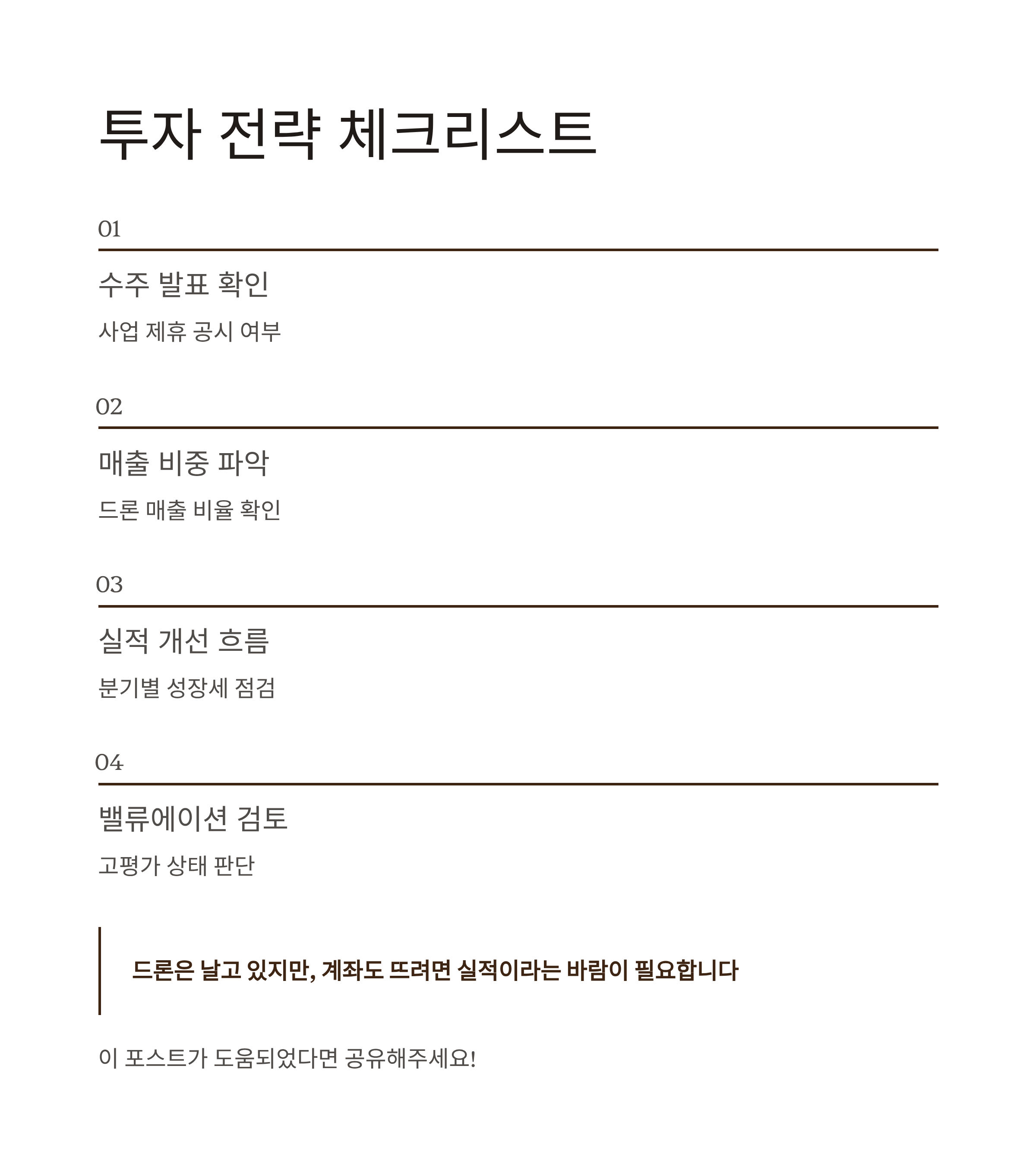 결론: 드론주는 ‘기대감’만으로는 위험, 가시적 수주 + 실적 개선 확인 후 진입 권장