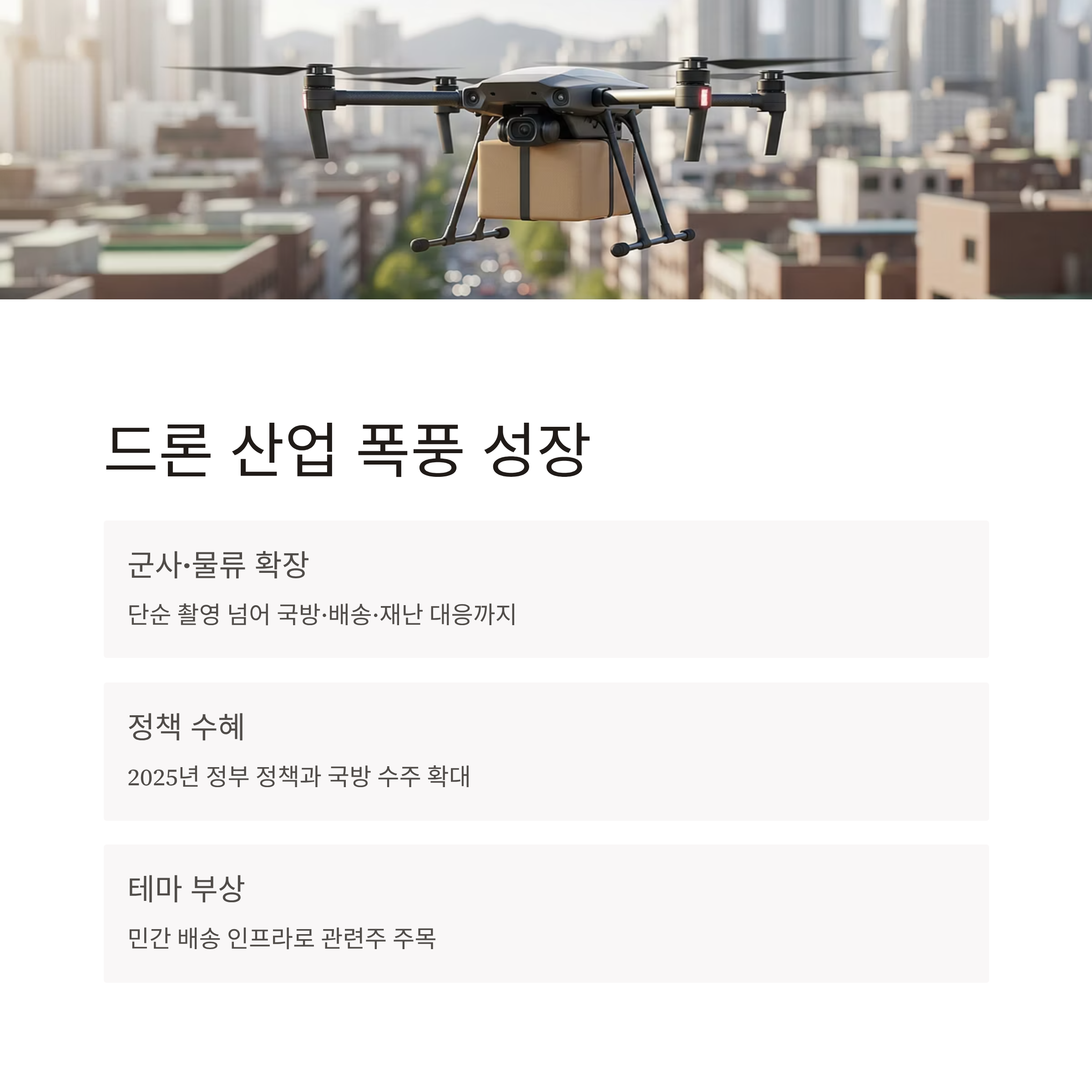 드론 산업이 단순 촬영용 기기를 넘어 군사·물류·재난 대응·UAM까지 확장되며, 증시에서도 관련주들이 주목받고 있습니다. 특히 2025년 하반기 들어 정부 정책, 국방 수주, 민간 배송 인프라 확대 등이 맞물리며 드론 관련주들이 다시 테마로 부상 중인데요.