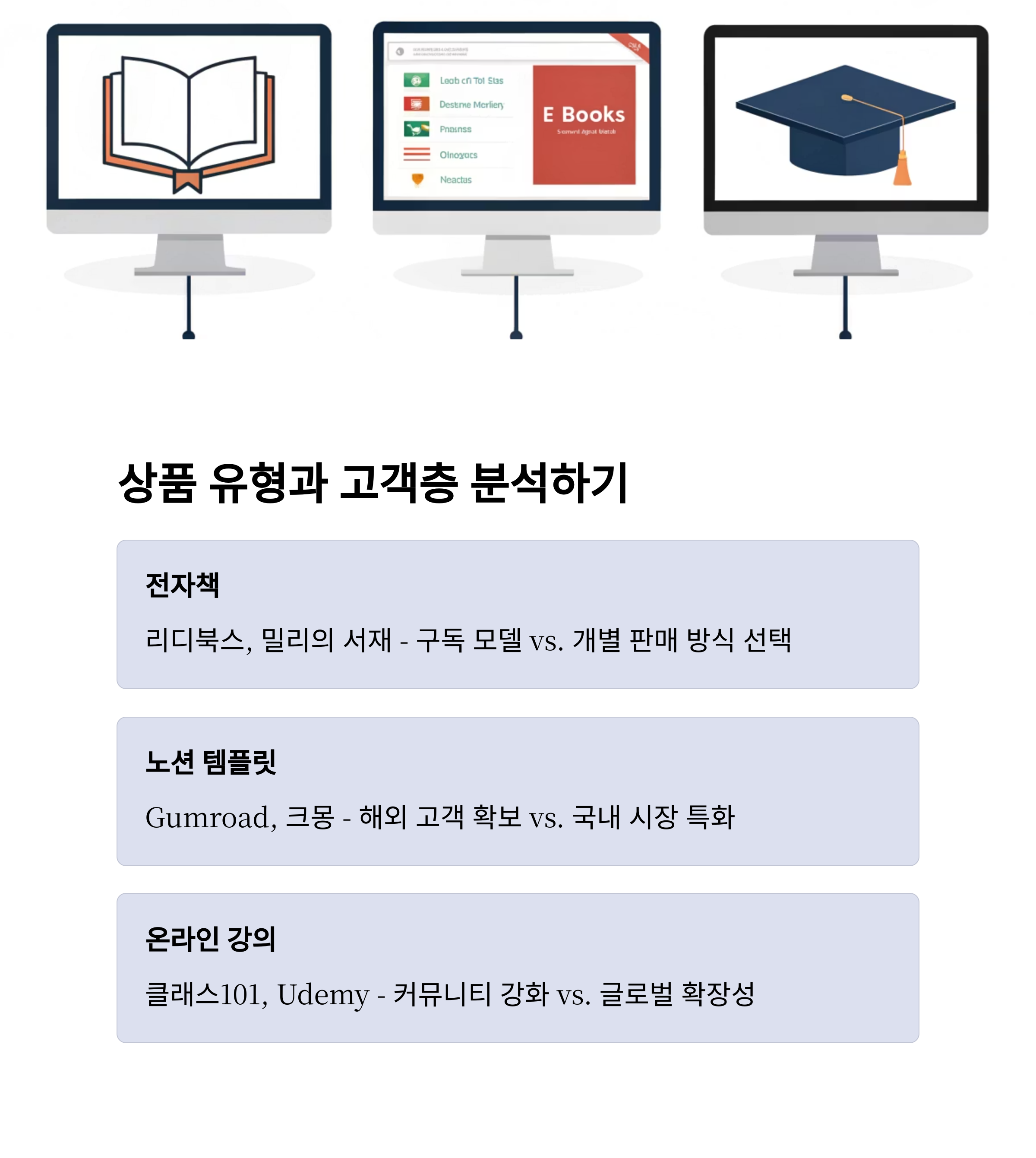 | 검색 유입 기반 전자책, 템플릿 판매 | 강의 기반 콘텐츠 마케팅에 강함 | 노션 템플릿, 툴 기반 디지털 콘텐츠 유통 |
