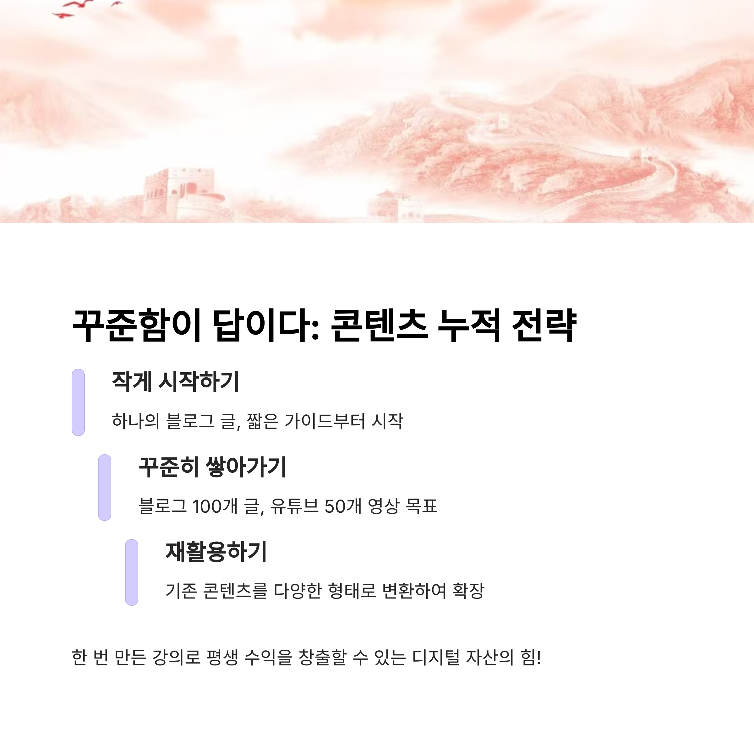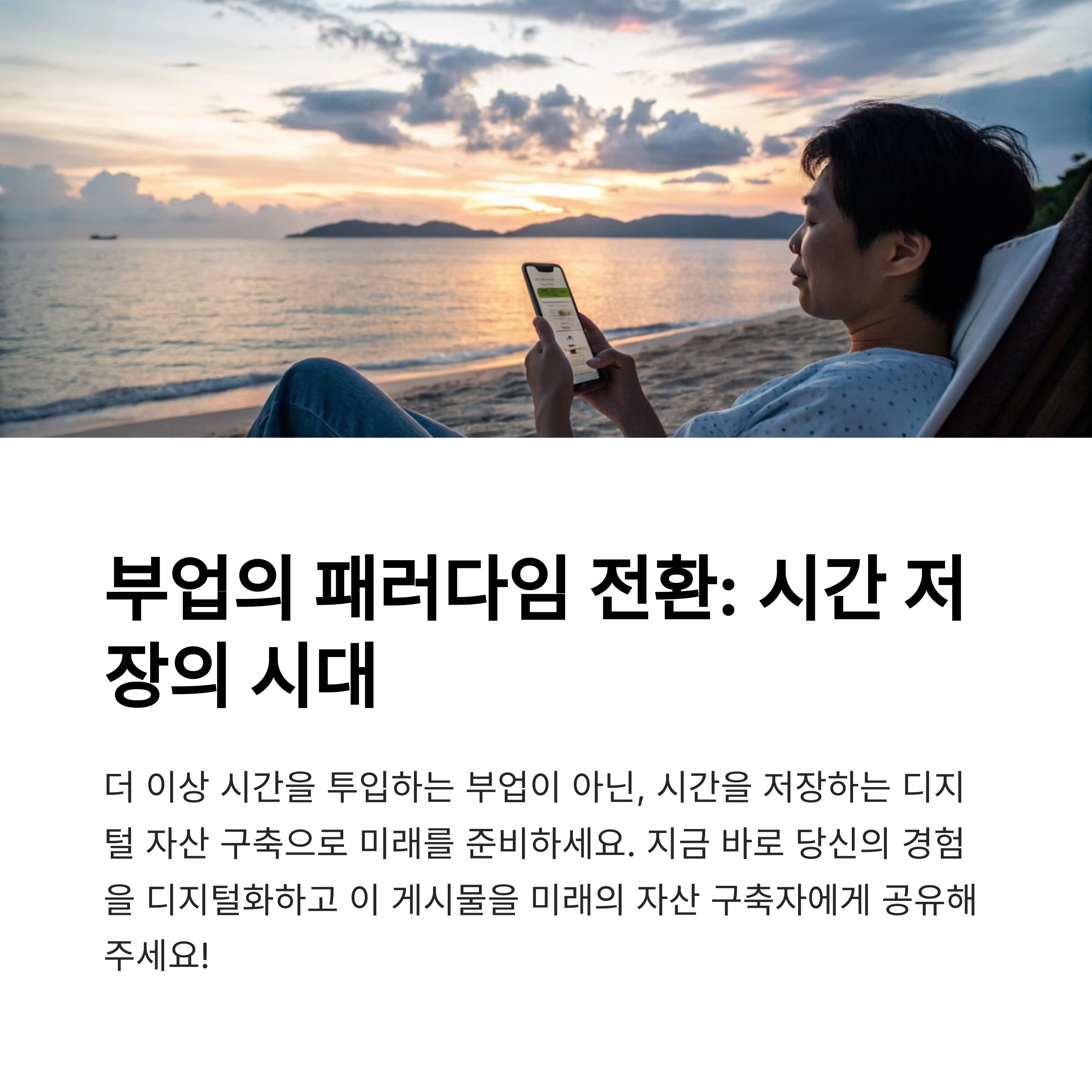 디지털 자산은 시간을 투입하는 게 아니라, 시간을 축적하는 방식입니다. 1회성 수익이 아닌, 장기적인 누적과 반복이 가능하다는 점에서 이제 부업의 기준도 ‘즉시성’에서 ‘지속성’으로 바뀌고 있습니다. 여러분의 경험을 자산으로 바꿔보세요. 작게 시작해도, 결국 강해집니다.